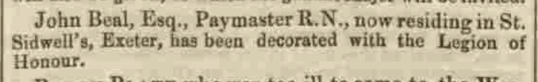 During his time at the Crimea War, John's daughter Jessica Sophia married Frederick HELMORE at All Saints Church, West Ham in London. It is likely Jessica was living with her sister-in-law Ann KEITH at the time. Life in ExeterJohn was paid off from HMS Queen on 21 September 1855 and his association with the Navy ended on 25 July 1856. He was now living at St Sidwell, Exeter, where he appears to have lived for the rest of his life. In 1856 he was awarded the French Legion of Honour for his services as Paymaster in the Royal Navy (resumably for his services in the Crimean War). This was widely reported in the newspapers on 2 August 1856 .