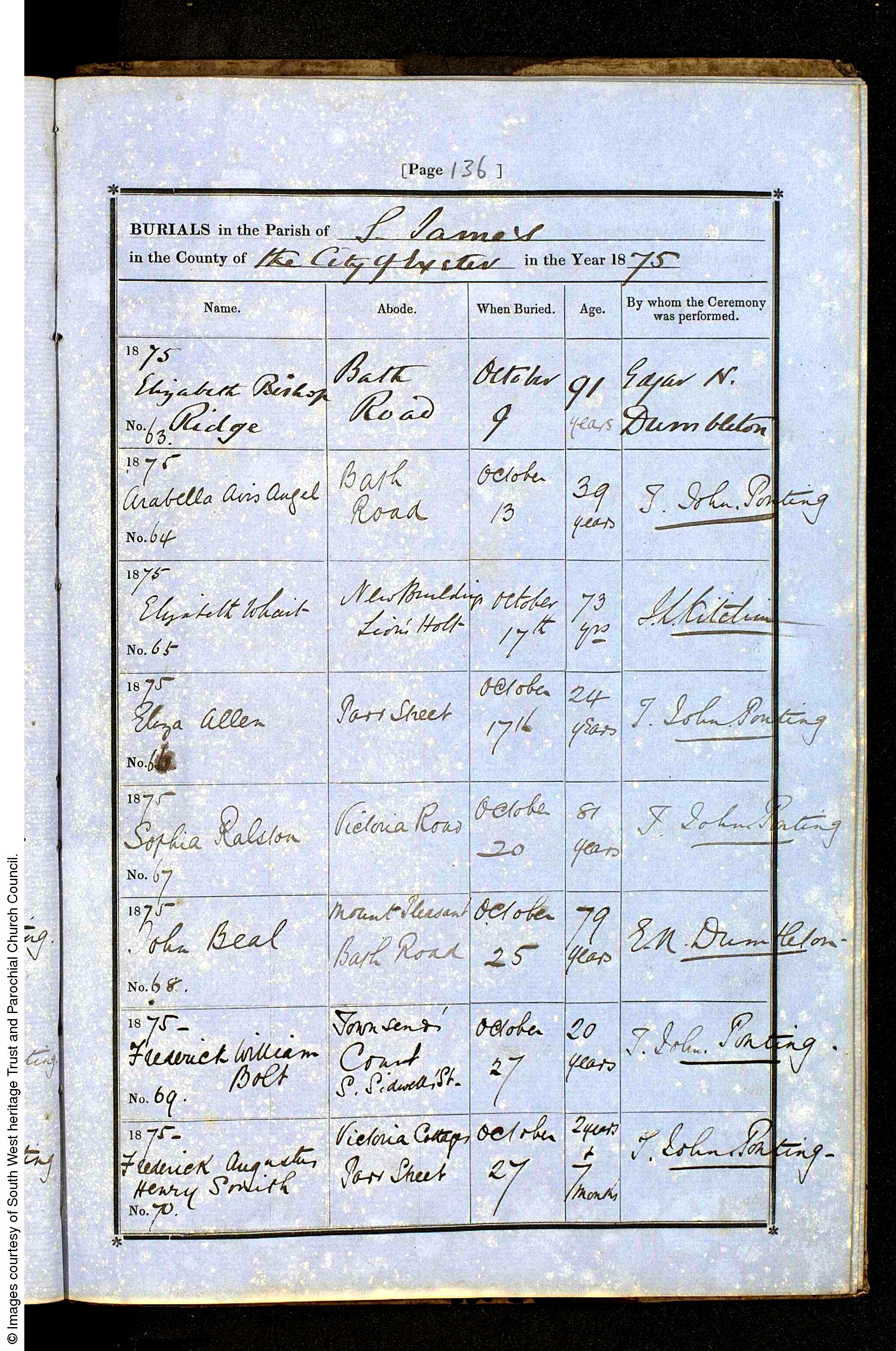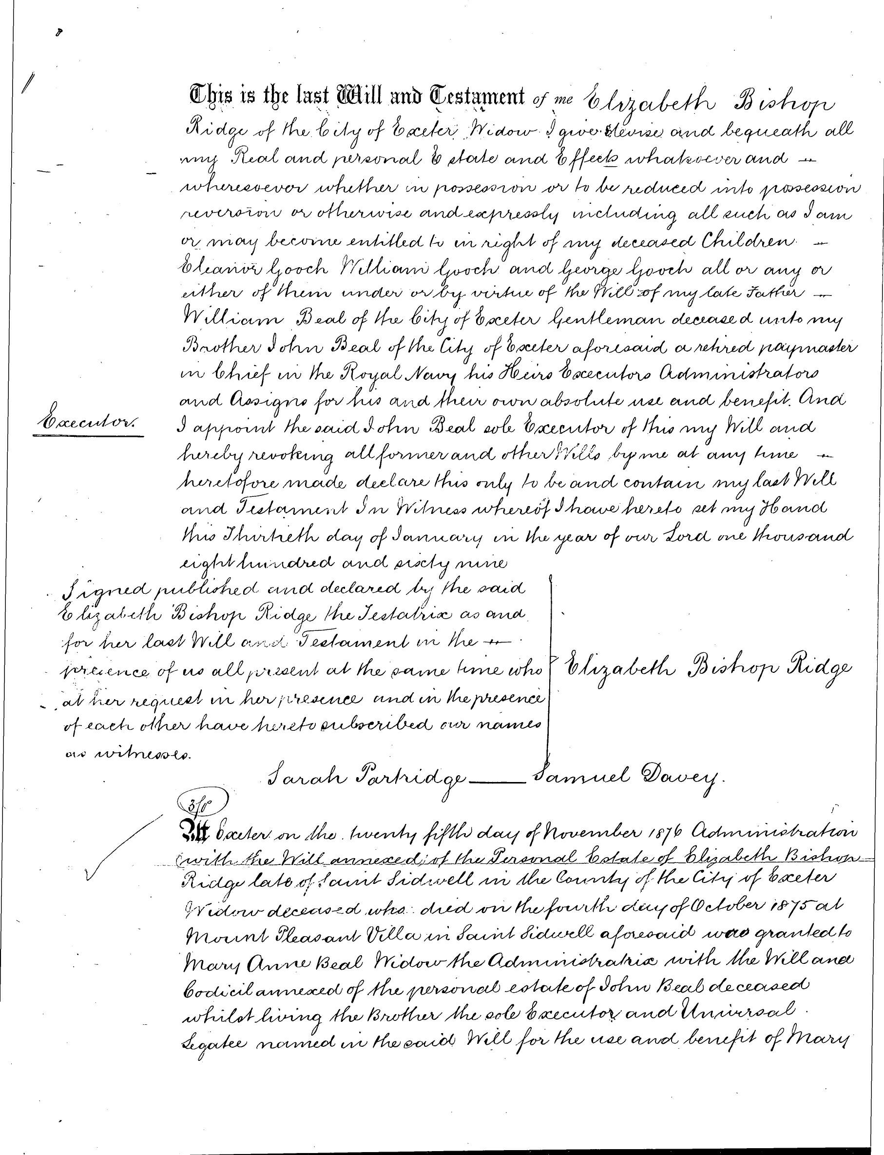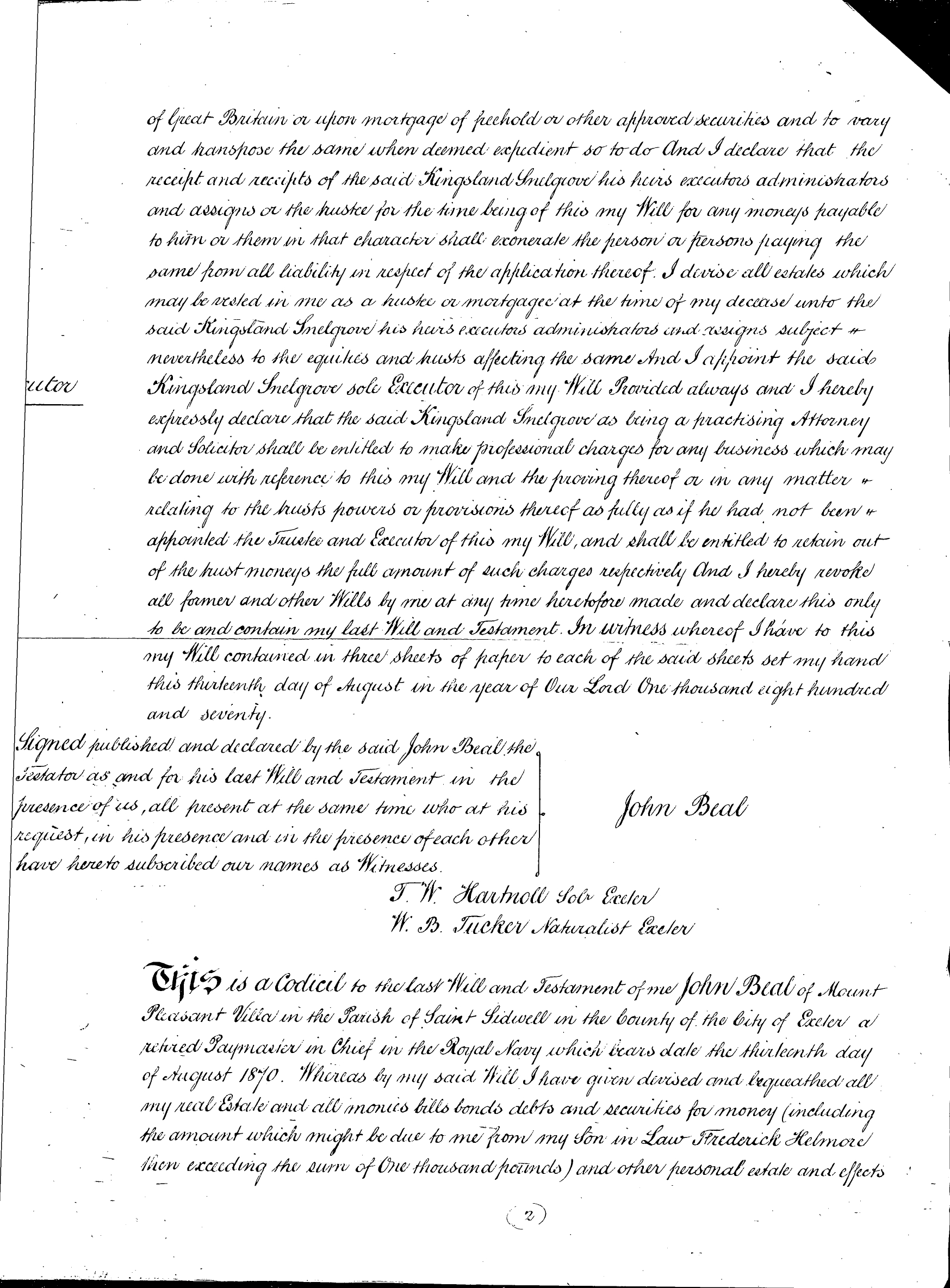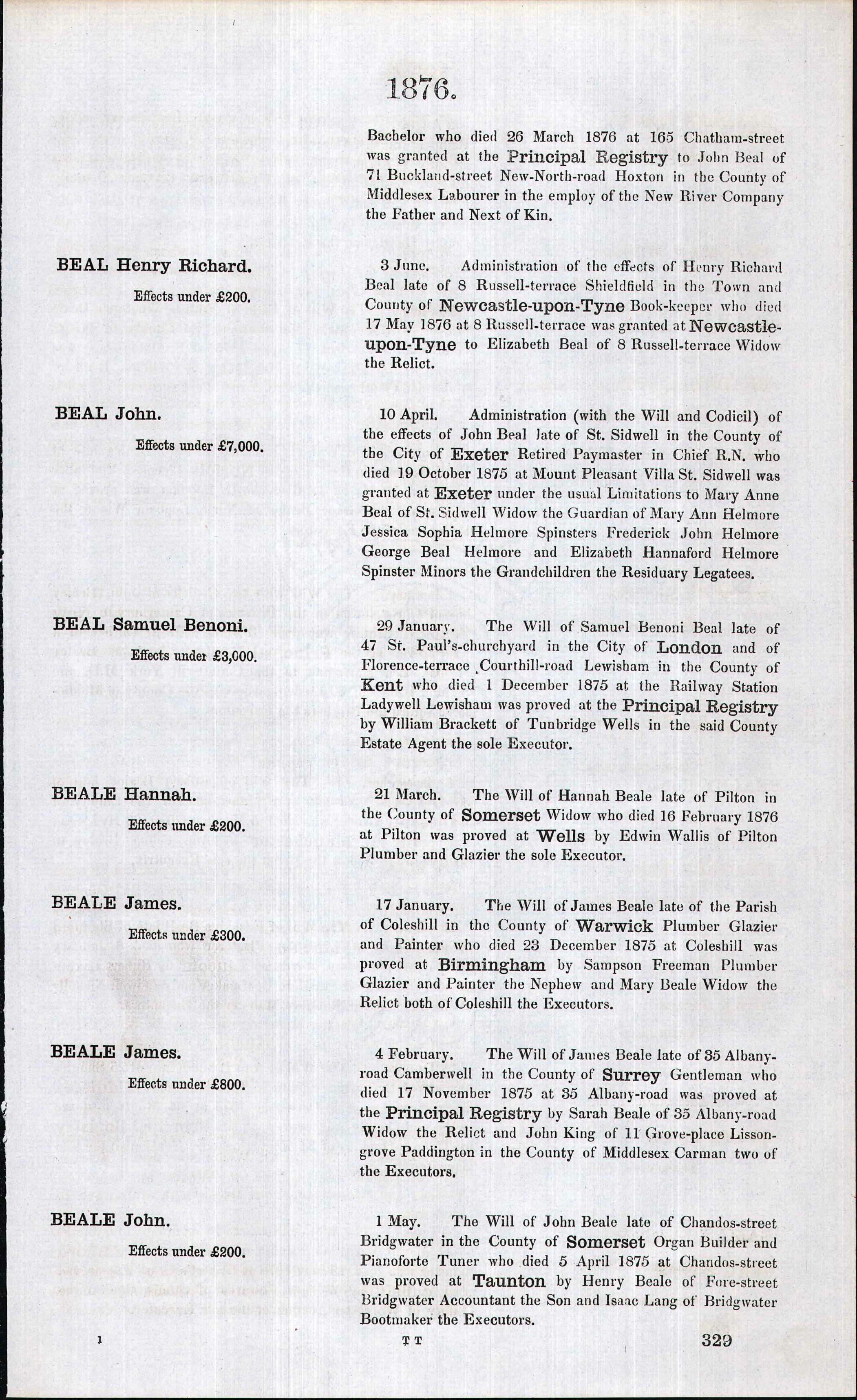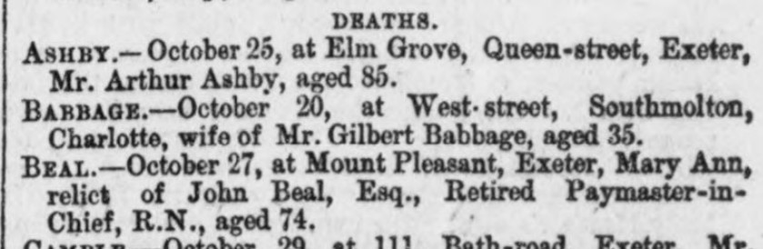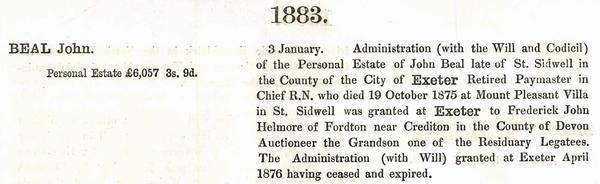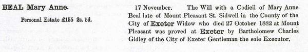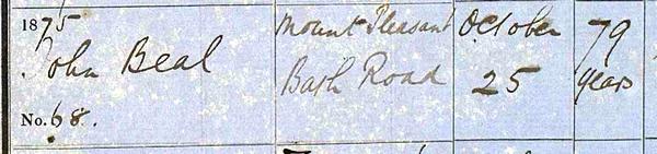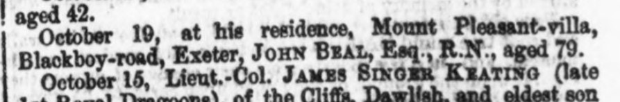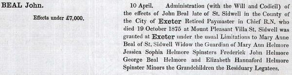 John BEAL died in Exeter on 19 October 1875. He is buried at St James Church, Mount Pleasant Road, Exeter.
