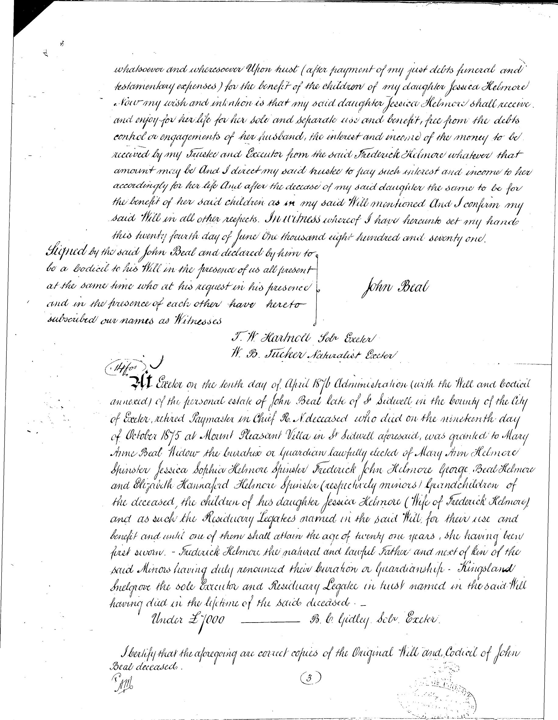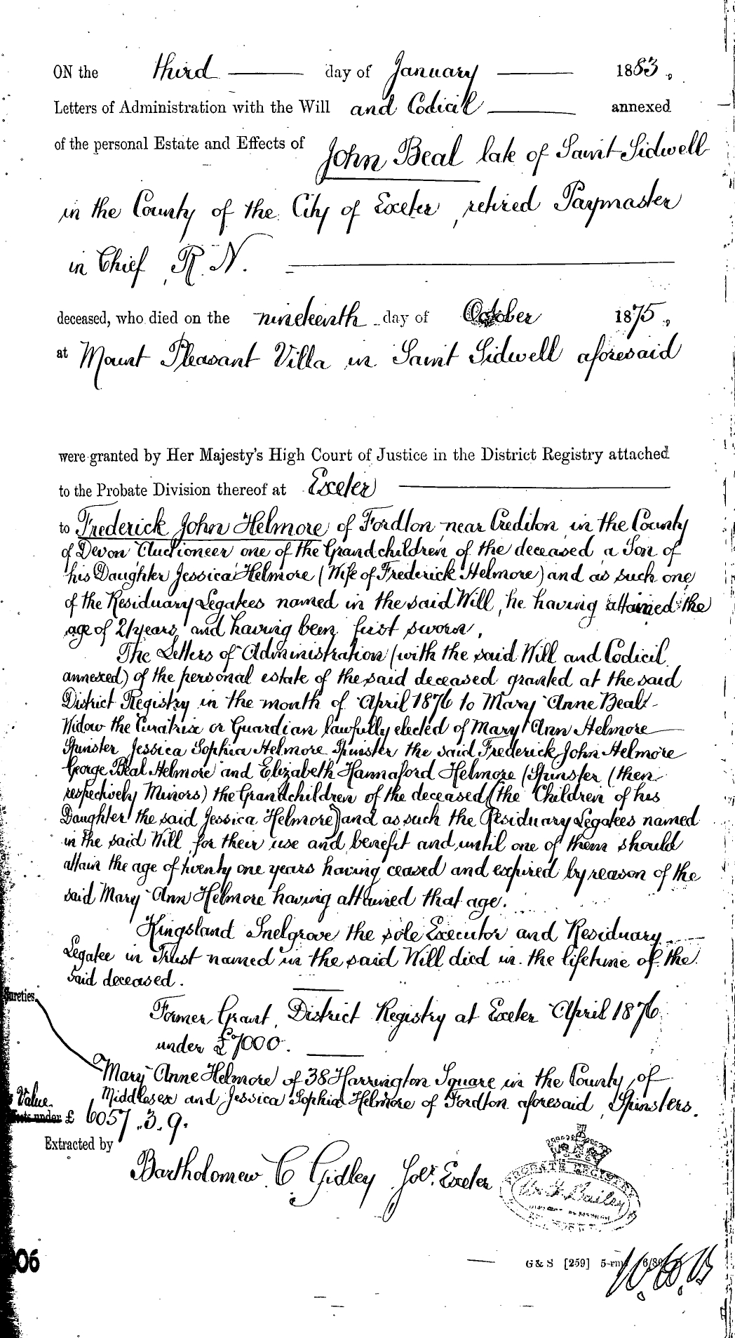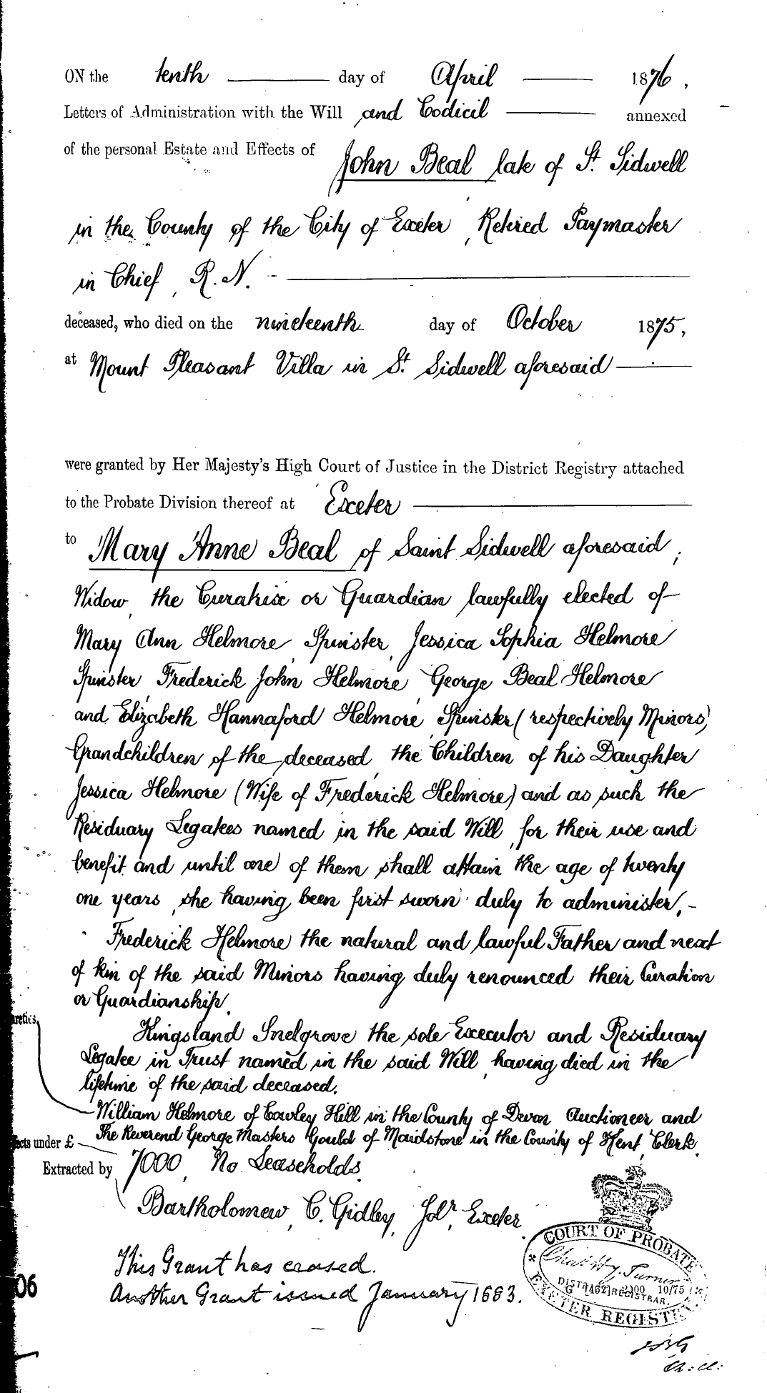 John BEAL left a Will, with his wife Mary Ann the executrix, the guardian of his grandchildren. The Grant remained in effect until one of the grandchidren had attained 21 years. This happened in 1877 when Mary Ann HELMORE reached 21, but it was not until the oldest male, Frederick John reached 21 that he applied for administration of the Will.