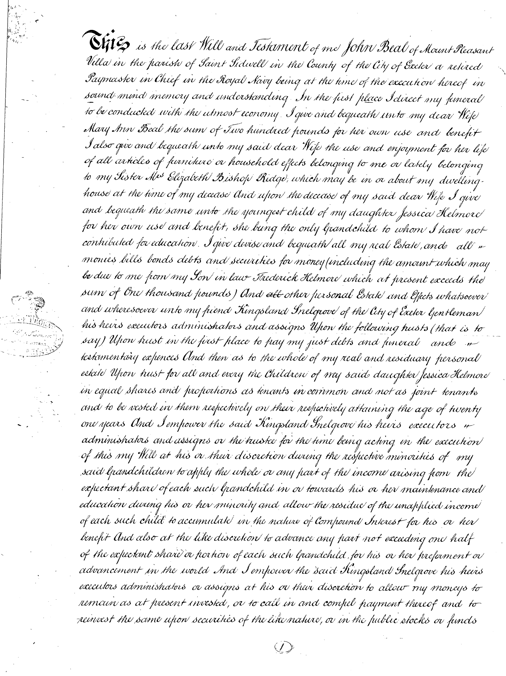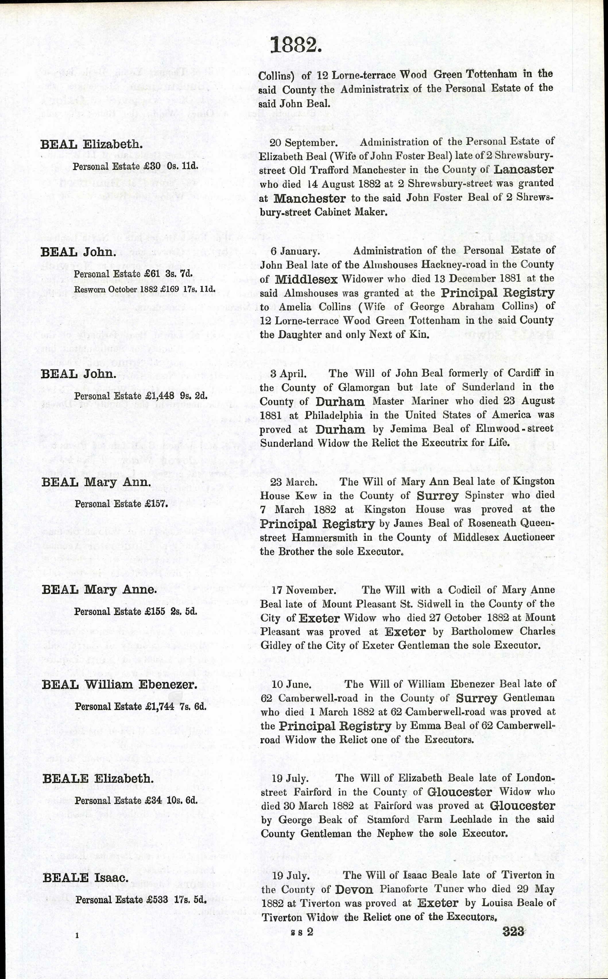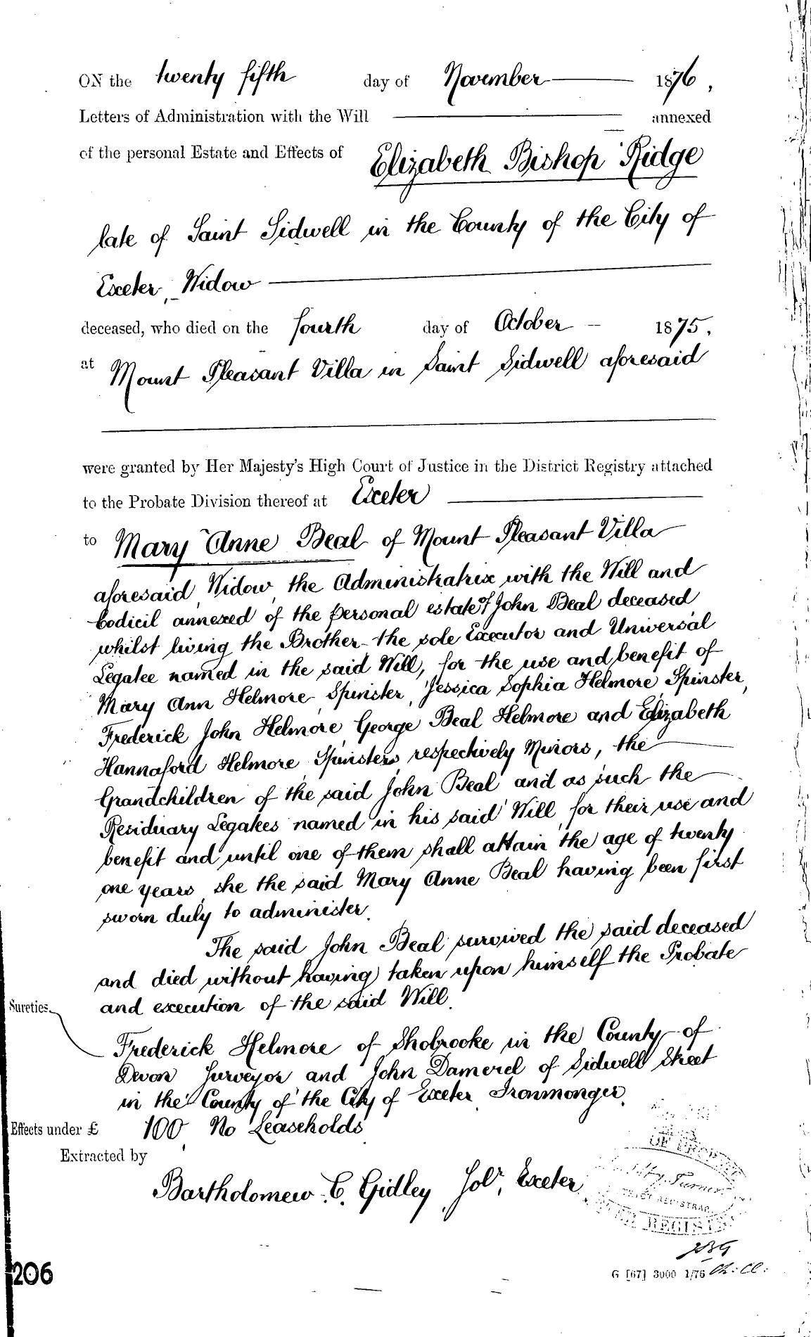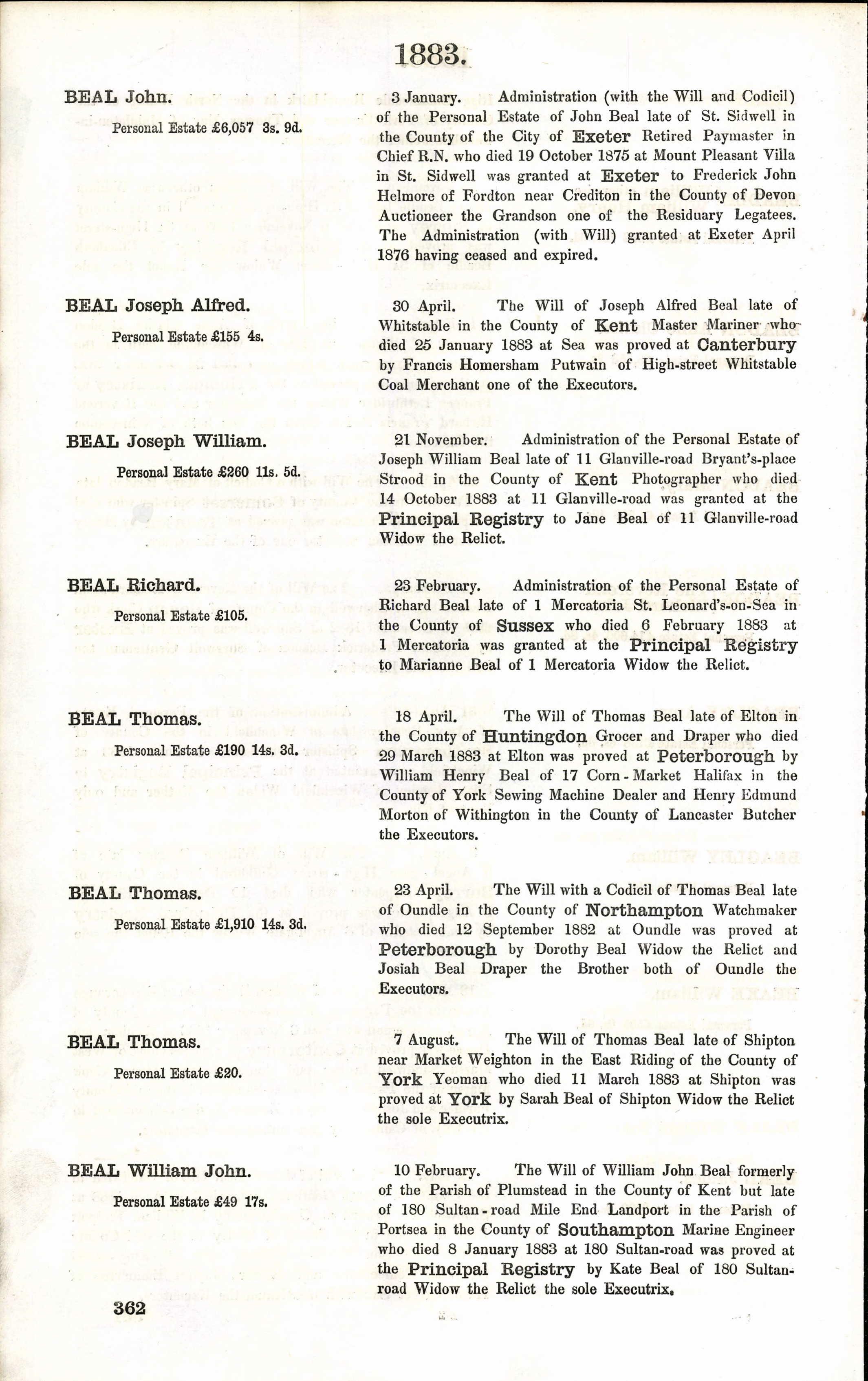 John BEAL left a Will, with his wife Mary Ann the executrix, the guardian of his grandchildren. The Grant remained in effect until one of the grandchidren had attained 21 years. This happened in 1877 when Mary Ann HELMORE reached 21, but it was not until the oldest male, Frederick John reached 21 that he applied for administration of the Will.