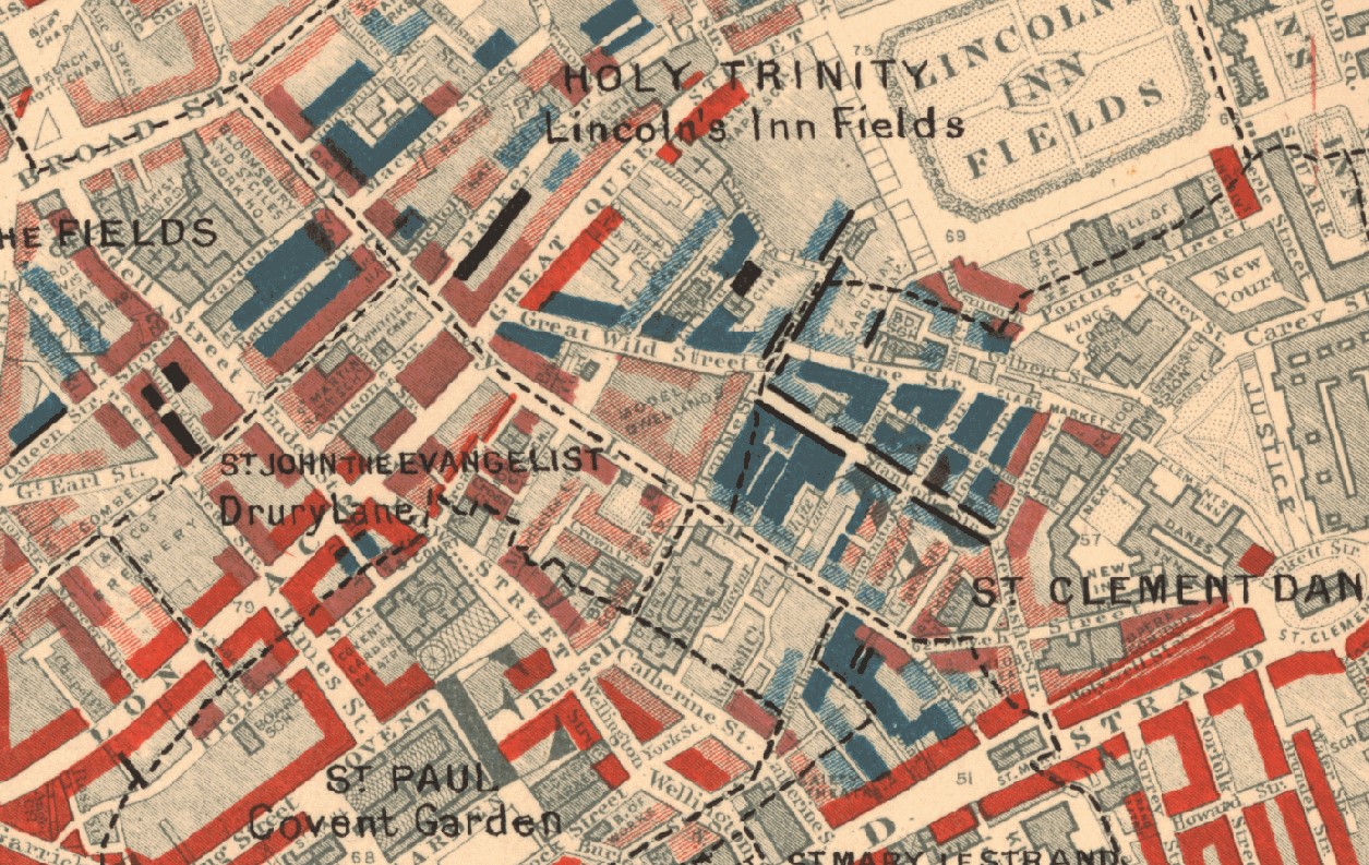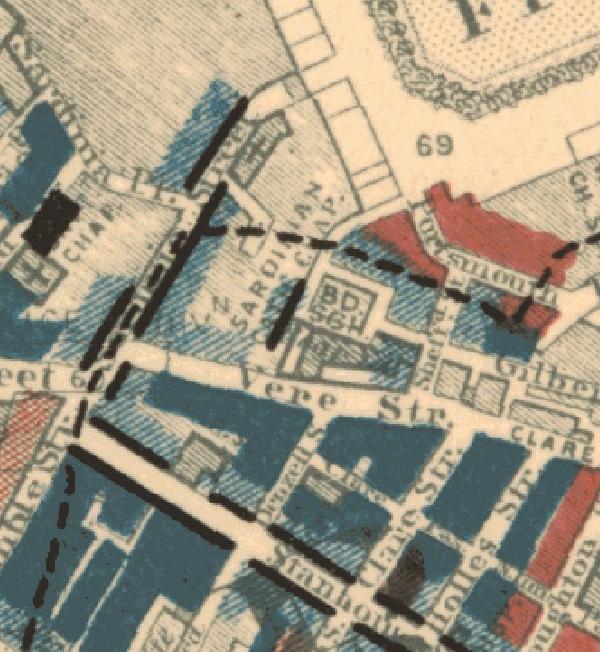 Charles Booth's Poverty Map of LondonCharles Booth, the founder of the Salvation Army, produced a detailed map of the areas of poverty and wealth in London, dated from the 1880s. Although this is a few years after Susan died, Vere St was described in Booth's notebook as "..With one of two exceptions occupied by the poor and very poor Classes and some of the Rough Class. Bad as regards sanitary matters."