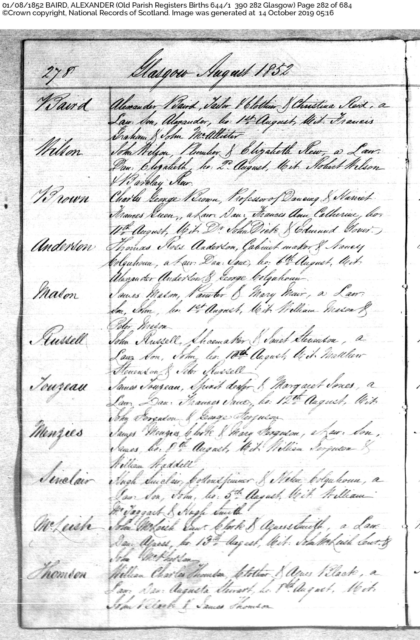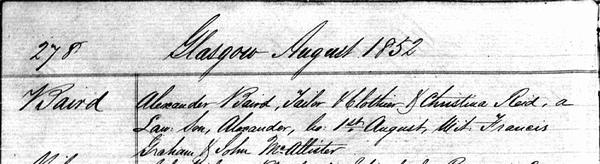 Alexander BAIRD was born in Glasgow on 1 August 1852 to Alexander BAIRD and Christina REID (there were several Alexander Baird children born in Glasgow around this time, but only one has a mother with maiden name of REID). His father was a tailor and clothier.