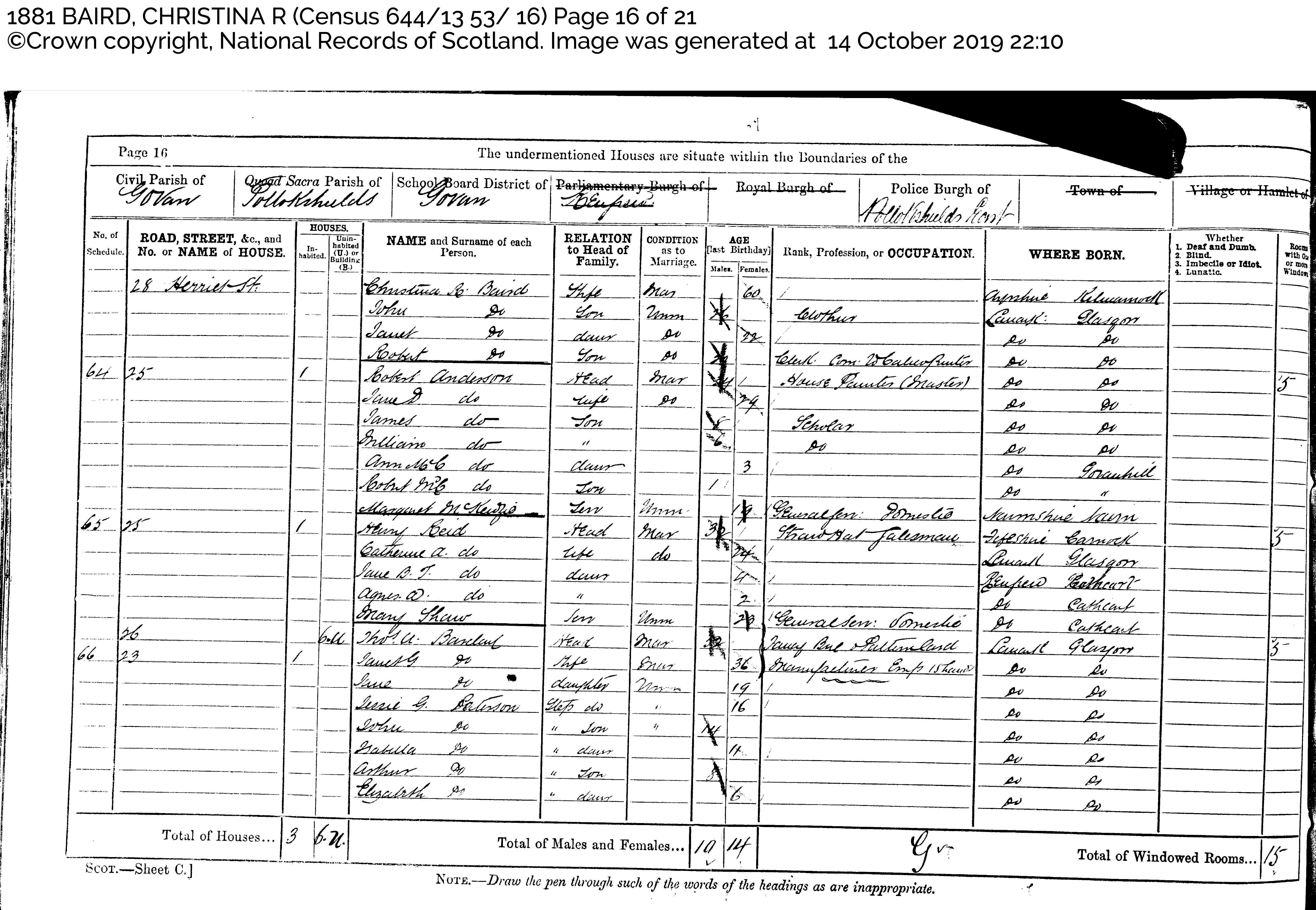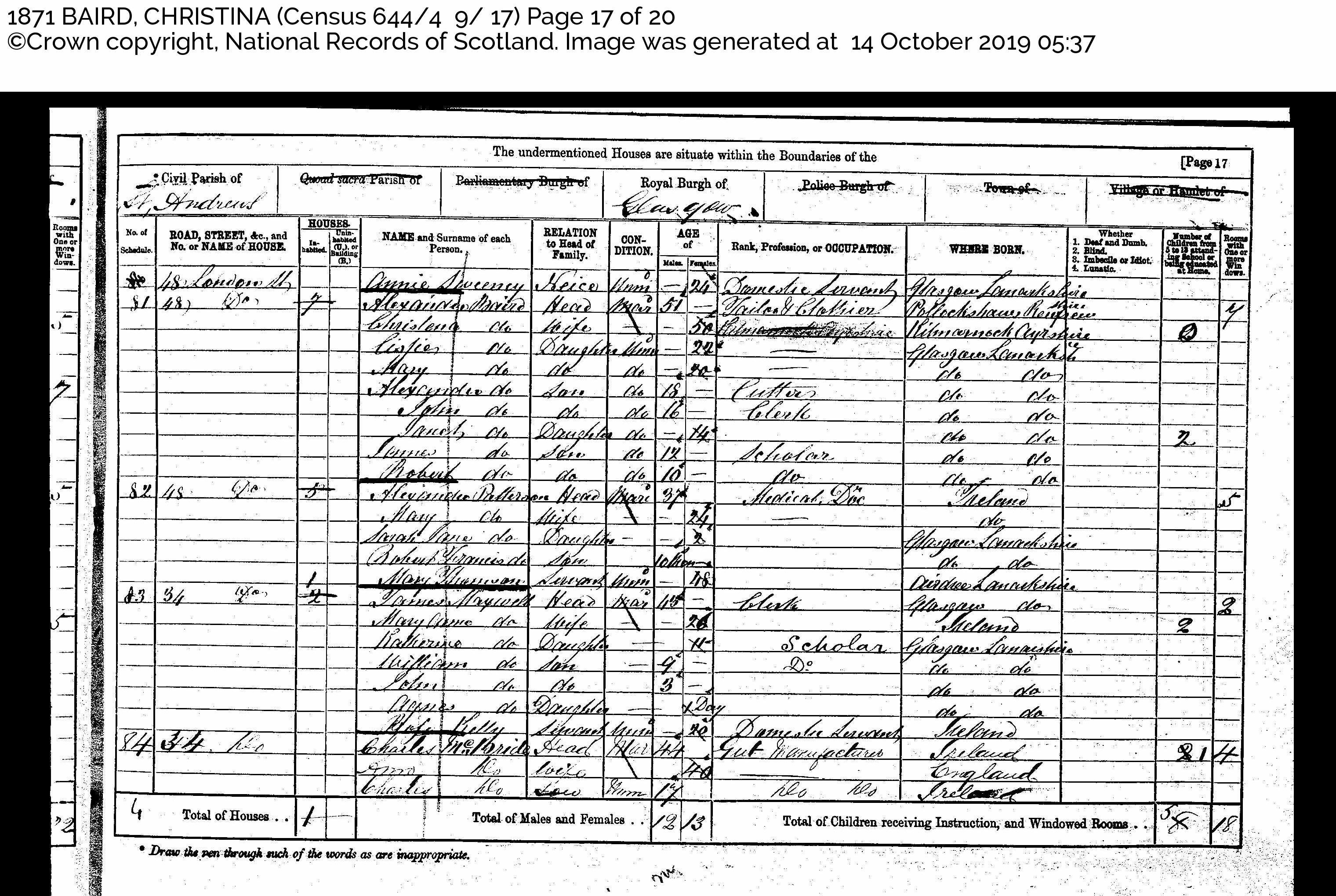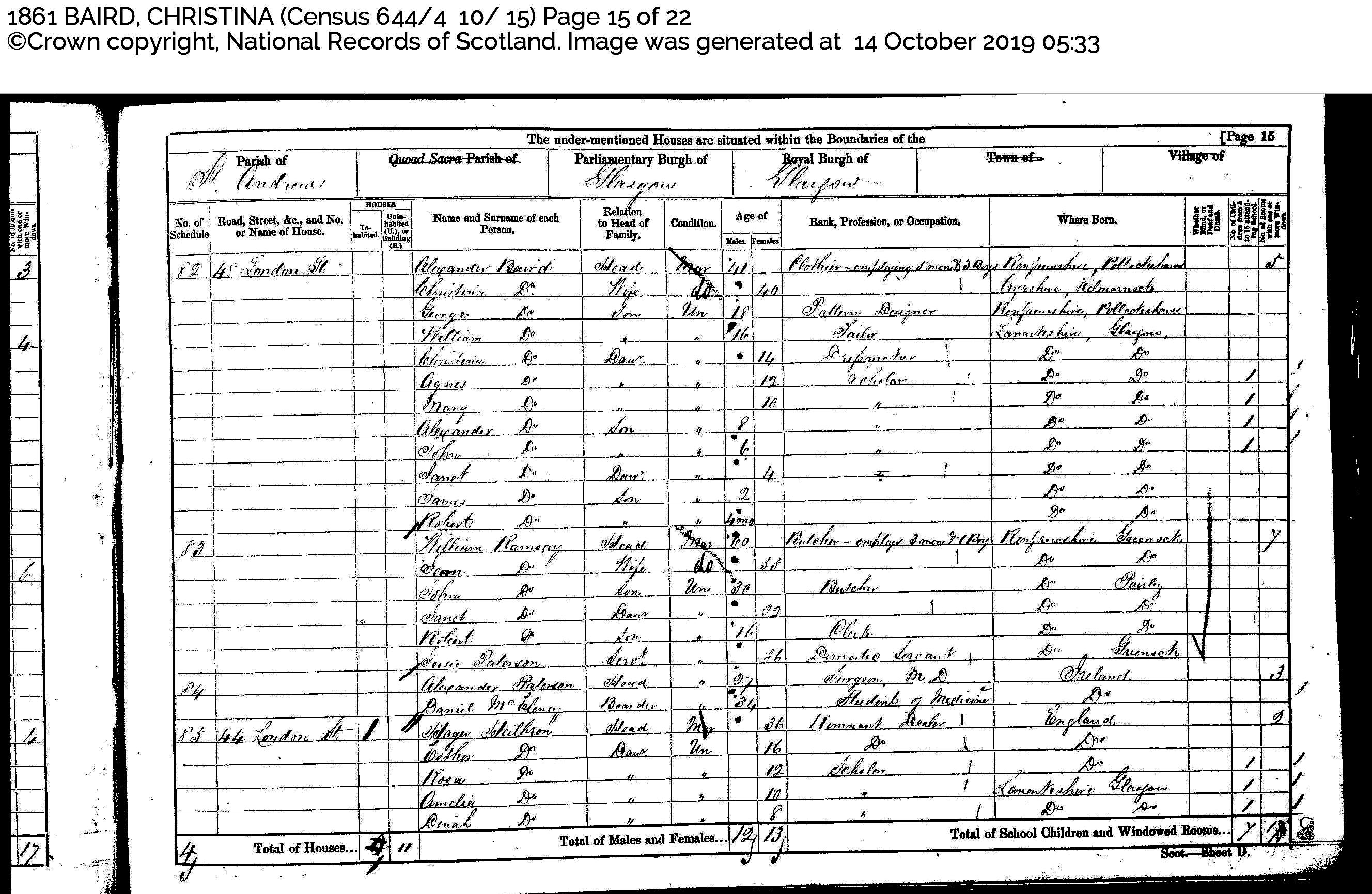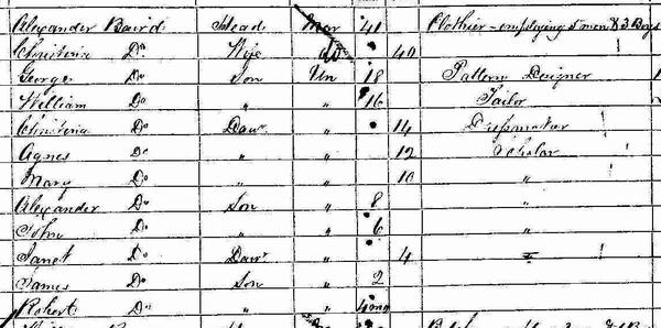 Alexander came from a large family. The 1861 census records 10 children living at 48 London St, Glasgow. This address is in central Glasgow close to the Tolbooth and opposite the imposing MerCat Tower Building (London St was renamed to London Rd in 1920). In 1871 Alex was aged 18 and a tailor's cutter. By the date of the 1881 census (3 April 1881), Alexander was living elsewhere, perhaps he was already in Adelaide.