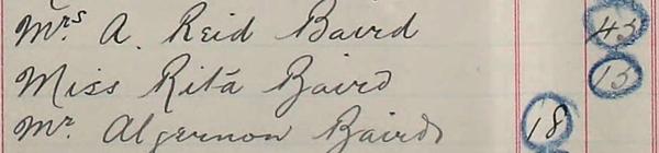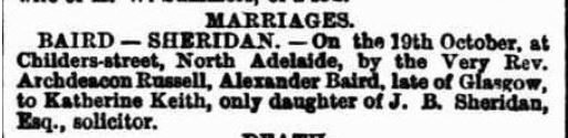 Marriage to Alexander BAIRDKatherine married Alexander Reid BAIRD at the Sheridan's Childers St home on 19th October 1881. The newspaper notice remarks that Alexamber BAIRD is "late of Glasgow". (Note, the Reid middle name is only occasionally recorded, but most importantly in his obituary where it is noted that he had married Miss K.K. (Katherine Keith) SHERIDAN in Adelaide).