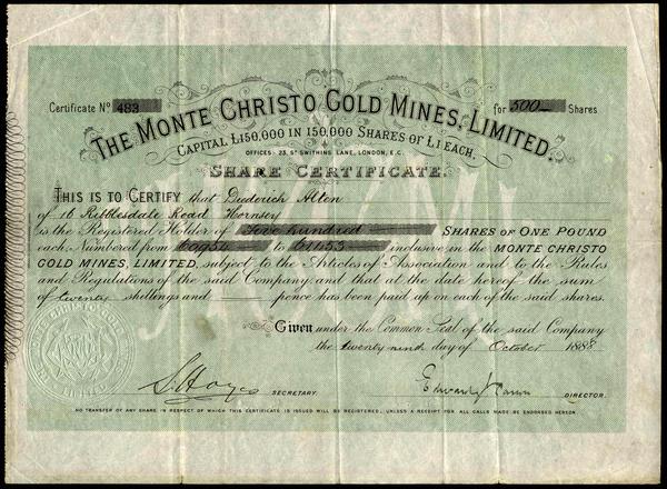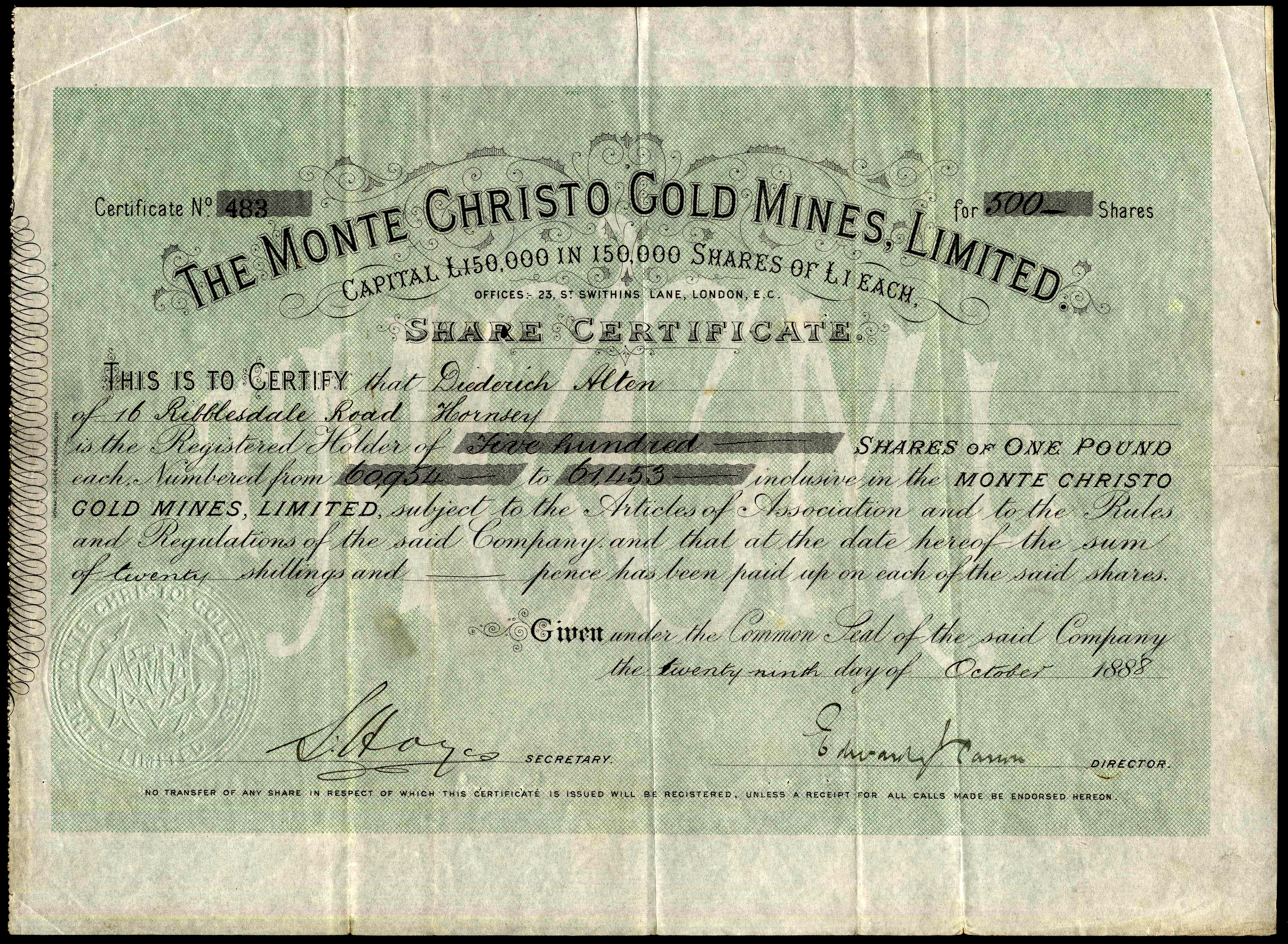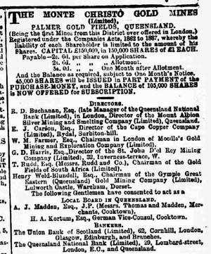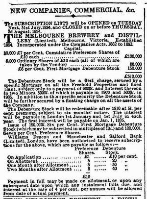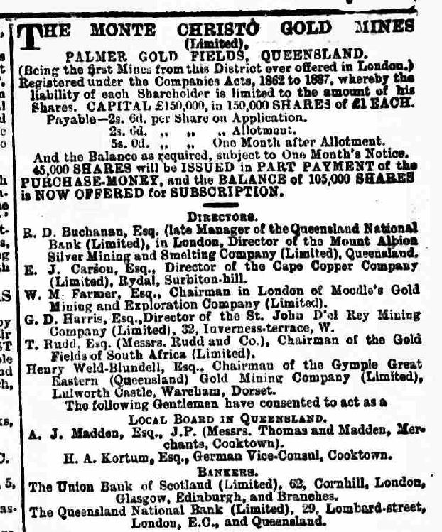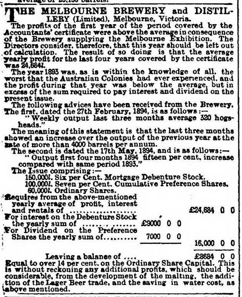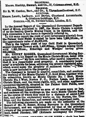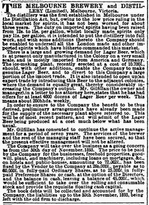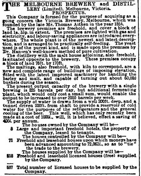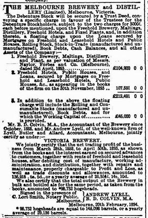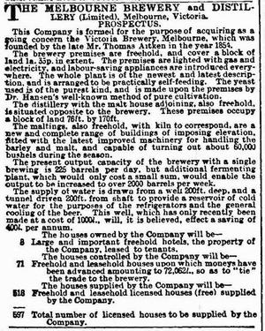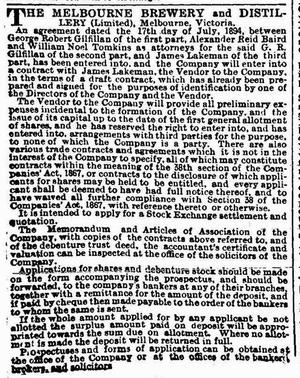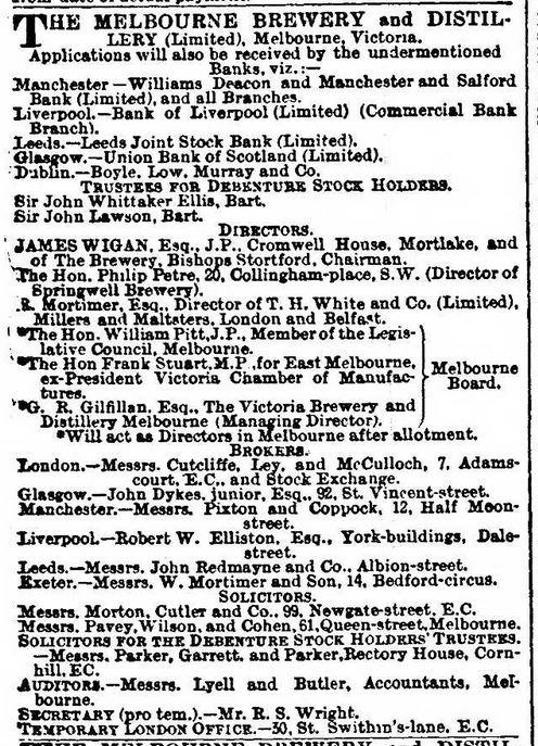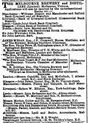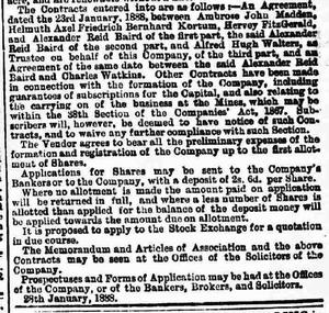 Separate Life and Death of Alexander Reid BAIRDAlexander Reid BAIRD lived an interesting life if his obituary is to be believed (see below). It states he was an entrepreneur of same note, dealing in land development, gold mines and even the funding for the Victoria Brewery in Melbourne as it is known today. He obviously did not live in Adelaide for long, but soon after marrying Katherine Keith SHERIDAN they moved to Melbourne. He floated the Monte Christo Gold Mine on the London market in 1888 and the Victoria Brewery in 1894. There was extensive newspaper advertising in London for these events and we can presume they were successful. In both occasions Alexander Baird's name appears only as a party to the underlying contracts. Note the similarity of the advertising and the structure of the offering. Note also that they both had their headquarters at 23 St Swithin's Lane, London. Alexander BAIRD is said to have visited London in 1886 soon after his son Algernon was born in Melbourne in 1885. He must have returned to Melbourne soon after, as his daughter Adeline was born in Melbourne in 1888. Presumably he was in London again in 1894 for the launch of the Victoria Brewery Company. The obituary records that Alexander returned to London, presumably permanently, in 1902 and later moved to Paris.