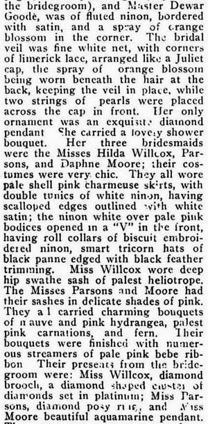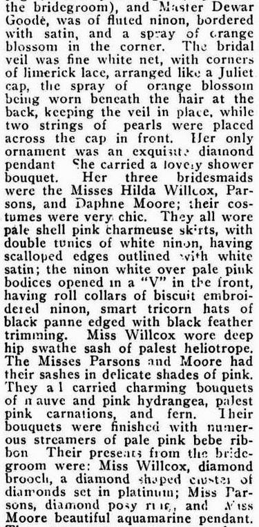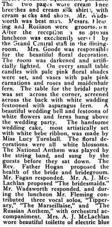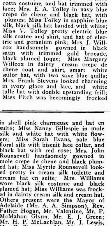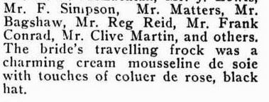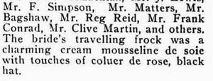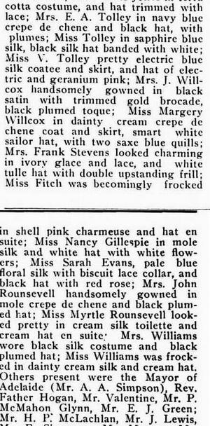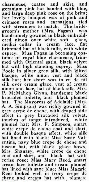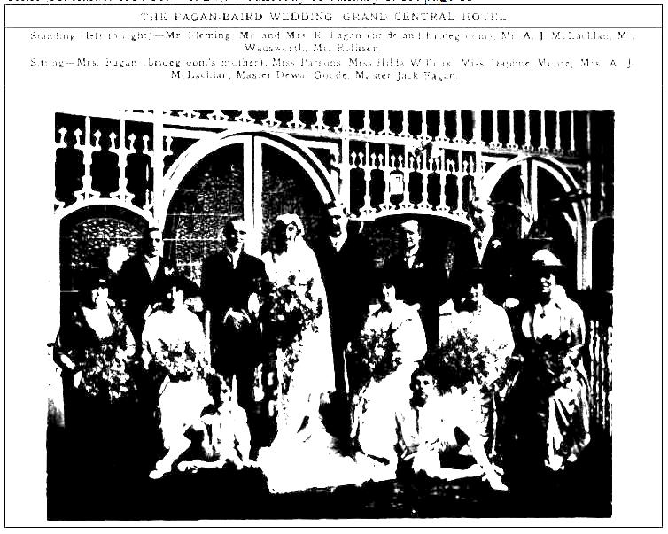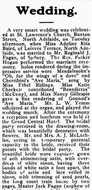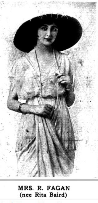 After the divorce, Rita dropped out of sight, and out of the social pages of the newspapers. Her mother, Elsie who had divorced her second husband in 1929 died in 1964. What happened to Rita? Adeline Rita Mary BAIRDAdeline was the only daughter of Alexander Reid BAIRD and Katherine Keith SHERIDAN. She was born in Melbourne in 1888, following one of Alexander's return visits to Australia. The family returned to Adelaide where they became an established part of the local social scene. There are numerous newspaper articles about Adeline (known as "Rita") and her mother. Adeline appears to have had a wide circle of friends with whom she attended many balls and social events. She was also flower girst or bridesmaid at several weddings. Adeline eventually (she was 26 years old) married William Reginald Joseph (Bill) FAGAN from a wealthy squatter family who owned a large farm at Mandurama, west of Sydney. Theirs was a society wedding in Adelaide in 1915, marrying at St Laurence Church, North Sydney. The local newspapers reported extensively on the occasion. The Critic, 13 January 1915, for instance devoted a whole page to the wedding (reproduced below.) Note that neither of Adeline's parents were present and that the guests were received by Mr and Mrs McLauchlan as temporary parents. Adeline's mother Katherine Keith SHERIDAN had died in 1911, but her father was still very much alive but living in Paris.