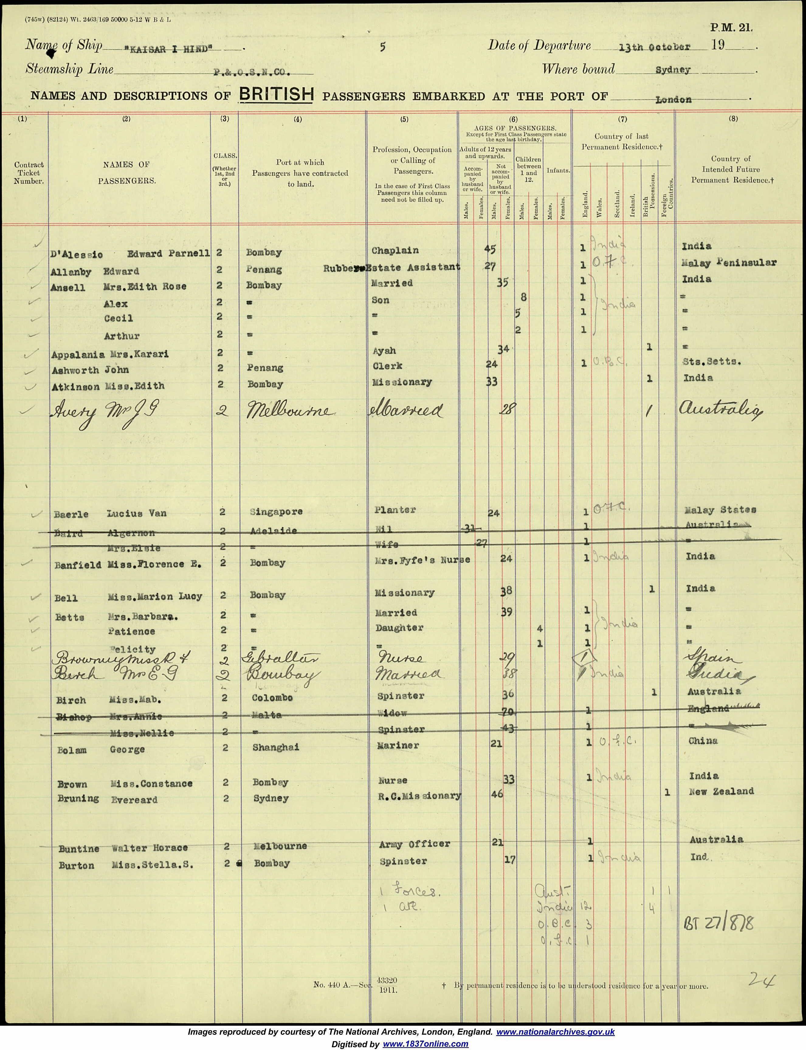Katherine and the children must have returned to Adelaide, as Algernon married Elsie WHITING there in 1912. Some time later he returned to London with Elsie. There is a shipping record for their return to Adelaide departing London on 13 October 1916 and arriving in Adelaide on 24 November 1916 by way of Marseilles, Bombay, Colomba and Fremantle. The ship was the Kaisar-I-Hind, a P&O ship built in Greenock in 1914 for the India route. The name means Empress of India in Hindi. The Bombay service was extended to Australia in 1916 and made 3 voyages to Australia that year. She was later used as a troop ship during the war. She was known as the "lucky ship" as she survived five torpedo attacks.