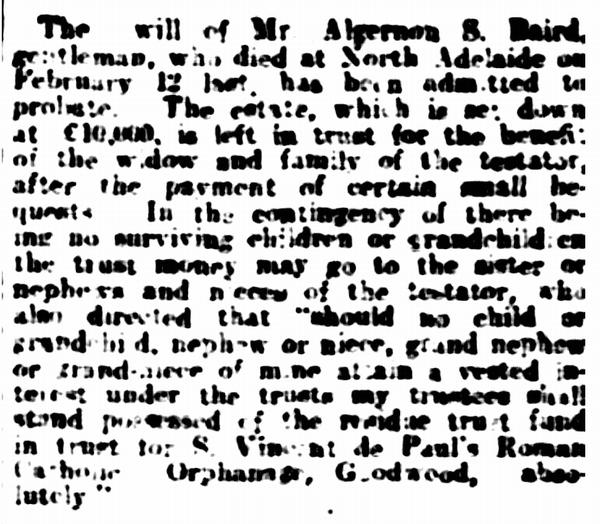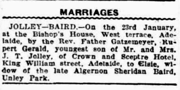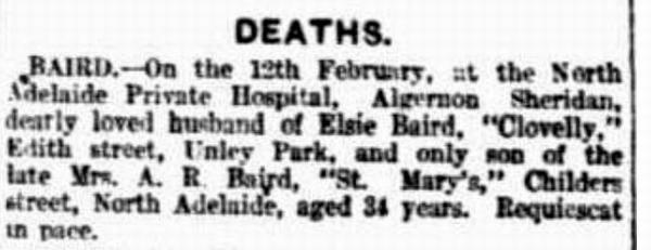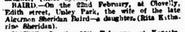 The Children of Catherine Keith SHERIDAN and Alexander Reid BAIRDAlgernon Sheridan BAIRDAlgernon was born in Melbourne, Victoria in 1885. The next we know of him is when he travelled with his mother and sister to London in 1903 to visit his father, but clearly he returned to Adelaide as he married there in 1912. Algernon married Elsie WHITING on 8 August 1912 at St Laurence's Church Adelaide. The church is in Buxton St a short distance from the Sheridan home in Childers St. Algernon and Elsie travelled to Britain after their marriage (presumably to visit his father Alexander). They returned to Adelaide in November 1916. Algernon died on 12 February 1920 at Edith St, Unley Park in Adelaide. He was only 35 years old. Tragically his wife Elsie gave birth to their only child, Rita Katherine Sheridan BAIRD, 10 days later on 22 February 1920. Algernon's Will was valued at "under £10,000". Elsie BAIRD remarried on 23 January 1924 to Gerald Rupert JOLLEY in Adelaide.