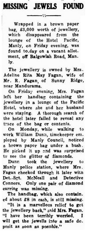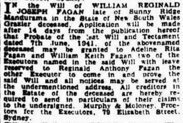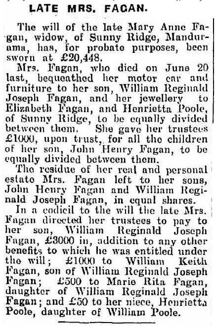 Adeline (Rita) and Bill FAGAN lived on the family farm at Sunny Ridge, Madurama, NSW, together with Bills' brother John FAGAN. Their mother Mary Anne FAGAN (née POOLE) died in 1920 and she left her motor car and furniture to Bill.