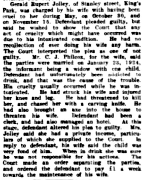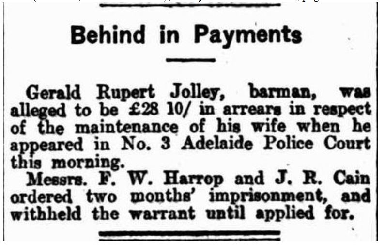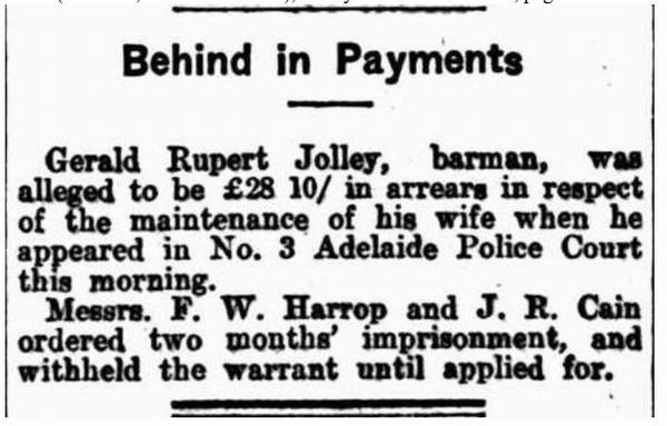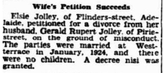 The marriage did not last long however, as it soon became apparent that Gerald was an alcoholic. Gerald was charged with assault and the Court ordered the parties to separate and for Gerald to pay £1 a week towards the maintenance of his wife. But being granted a separation was not the end of Gerald's or Elsie's troubles. Gerald was back in court again in November 1927 for arrears in maintenance. The marriage was finally ended by the court, when a decree nisi divorce was granted on 8 May 1929.