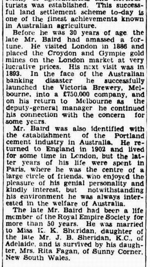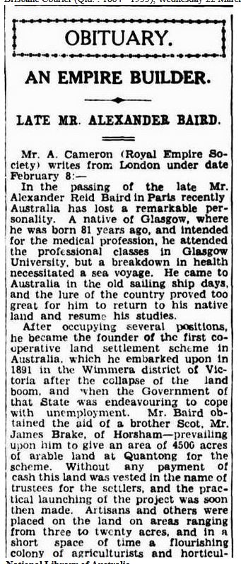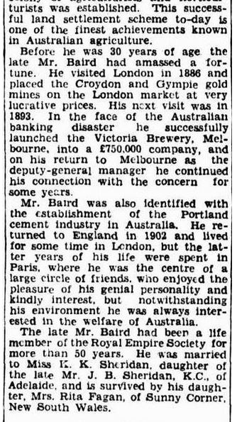 Alexander Reid BAIRD died in Paris in early 1933, aged 81 years. He had lived there for several years after moving from London. His death was widely reported in the Australian newspapers.