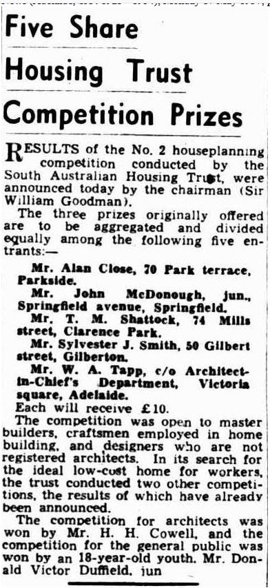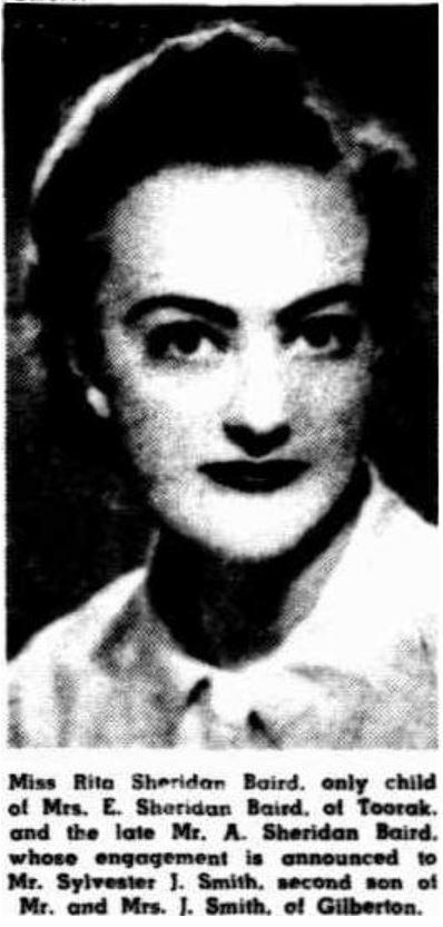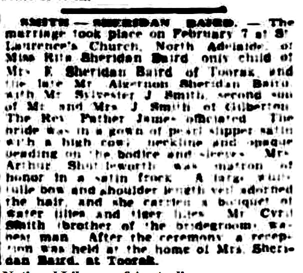 Rita Katharine Sheridan BAIRDRita was the only daughter of Algernon and Elsie BAIRD. She was born on 22 February 1920, 10 days after Algernon had died. Rita married Sylvester J. SMITH at St Laurence's Church, North Adelaide on 7 February 1942, the same church as her parents were married in. Their engagement had been announced in February 1941. Sylvester was living in Gilberton, another suburb of North Adelaide. After marriage the couple lived at 83 Alexandra Ave, Toorak, with Rita's mother. Who was Mr Sylvester J. SMITH? He does not appear to have been born in Adelaide. He was probably not the Sylvester Joseph SMITH who married Lorna BRENTON in 1933 (wrong ages) but may have been the Sylvester Joseph who died in Gilberton in 1960. He was however, the Sylvester J SMITH, living at 50 Gilbert St, who won a £10 prize for a house design in 1937. In the 1943 electoral roll, Sylvester's occupation was Architect.