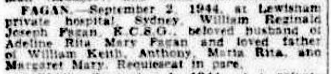 William (Bill) Reginald Joseph FAGAN died on 2 September 1944 at Lewisham Private Hospital, Sydney. He is buried in the Fagan family plot at Lyndhurst Cemetery, NSW.