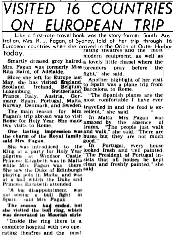 Adeline Rita appears to have remained at Sunny Ridge, Mandurama after Bill died. In 1950 she travelled overseas to visit Rome, but took in 16 European countries during her tour. She also attended a party at Windsor Castle and met King George VI. She then visited Malta to watch the Duke of Edinburgh play polo and then attended a ball with the Duke and Princess Elizabeth. (Note that her 3x great grandfather, Daniel KEITH was an acquaintance of the Duke of Kent, Elizabeth's 3x great grandfather.)