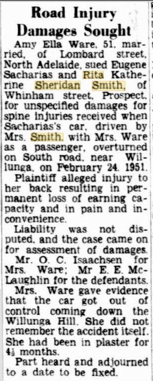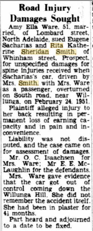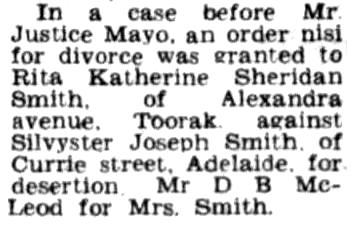 Divorce: On 9 March 1954 the newspapers reported the divorce of Rita Katharine Sheridan SMITH and Sylvester Joseph SMITH. Note that Rita's address was Alexandra Ave, Toorak - her mother's address.