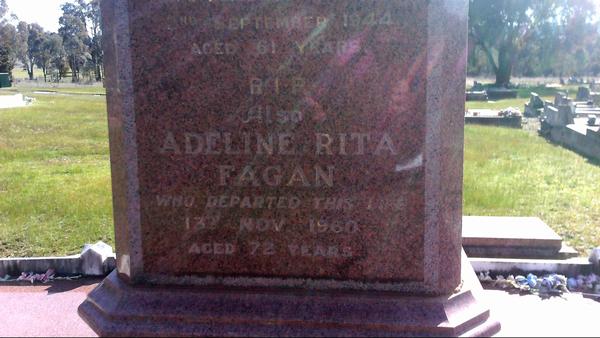 Adeline Rita Mary FAGAN (née BAIRD) died 13 November 1960 at Mandurama, NSW. She is buried in the Fagan family plot with her husband Bill.
