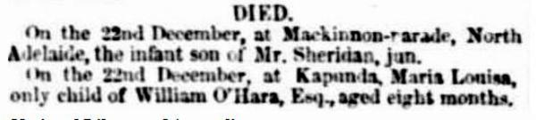 The Children of John Beal and Emma Mary SHERIDANJohn Reginald SHERIDANJohn Reginald was born 28 October 1855 at North Adelaide. He died at MacKinnon Parade 2 months later on 22 December 1855.