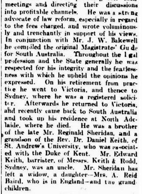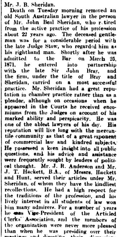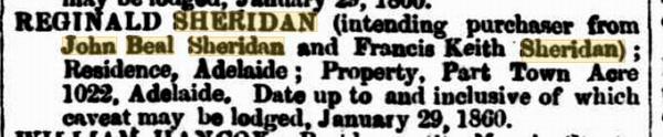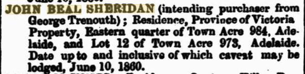 In Adelaide JB became a lawyer of some repute. He wrote several books, the first in 1879 being The Magistrates' Guide. Later works included a series of articles on law reform: JB also features in several newspaper articles, mostly about law issues, but also land sales. Two of these are of interest. The first is in January 1860 when he and his sister Frances sold a residence in Adelaide to their brother Reginald. The land is described as part Town Acre 1022, which today are the properties of 223-239 Stanley St, bordered by Stanley, New and Old Streets. The second deal was in June 1860 where JB bought two adjoining lots, being parts of Acre 984 and 973. Part of this property is today 50 Mackinnon Parade, where the Sheridan's lived for many years. (Part of a map showing the Town Acres can be seen here.)
