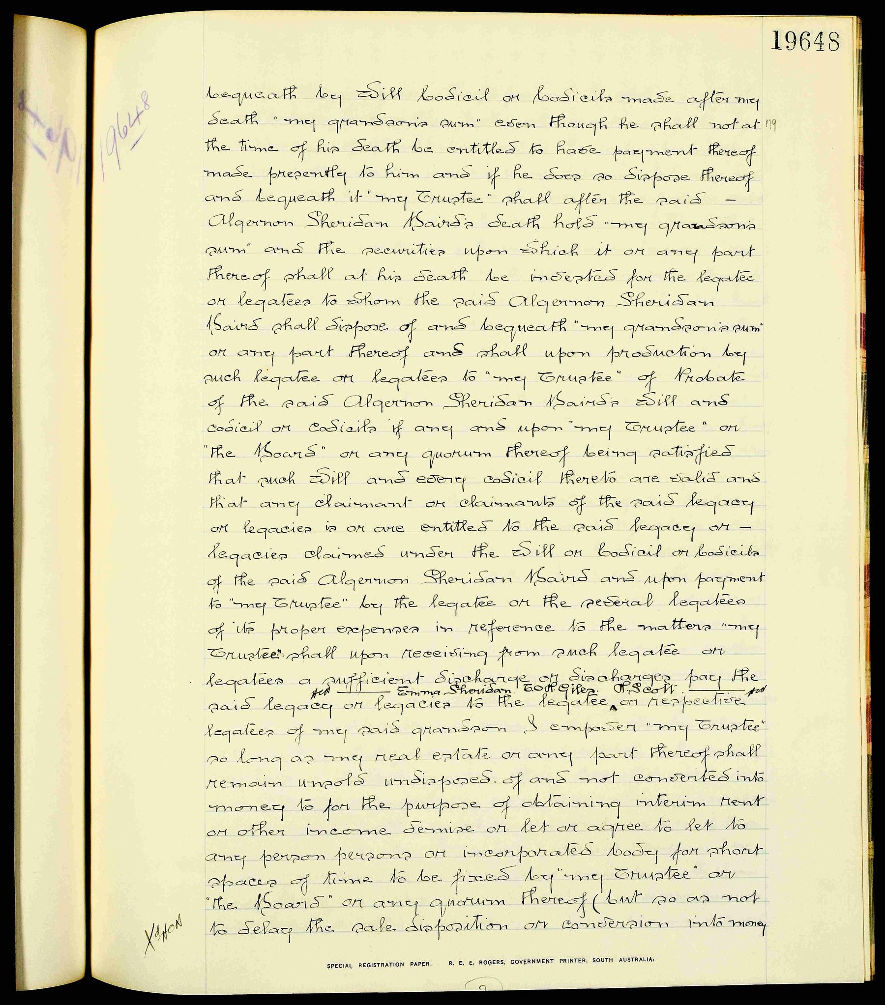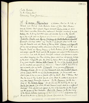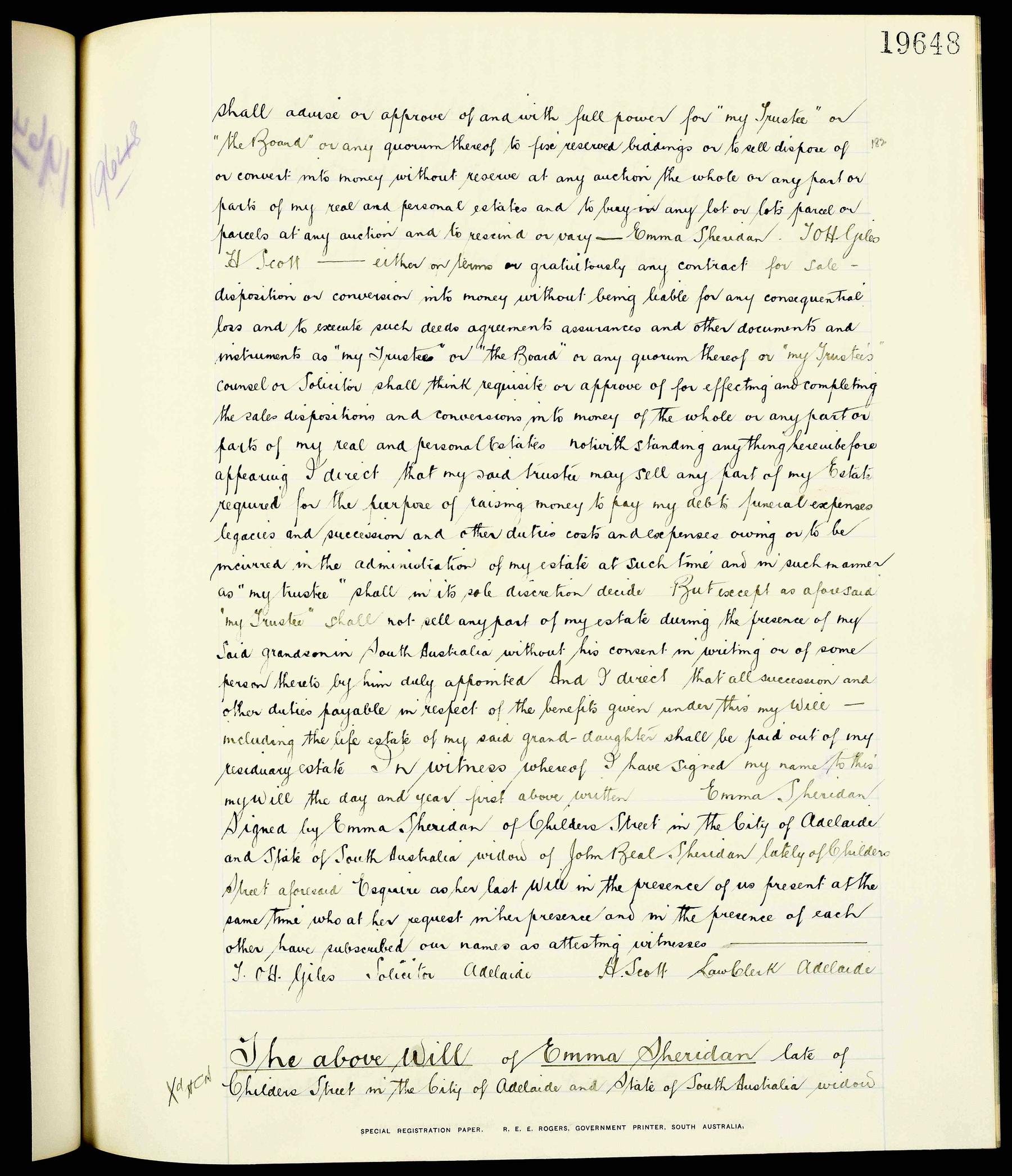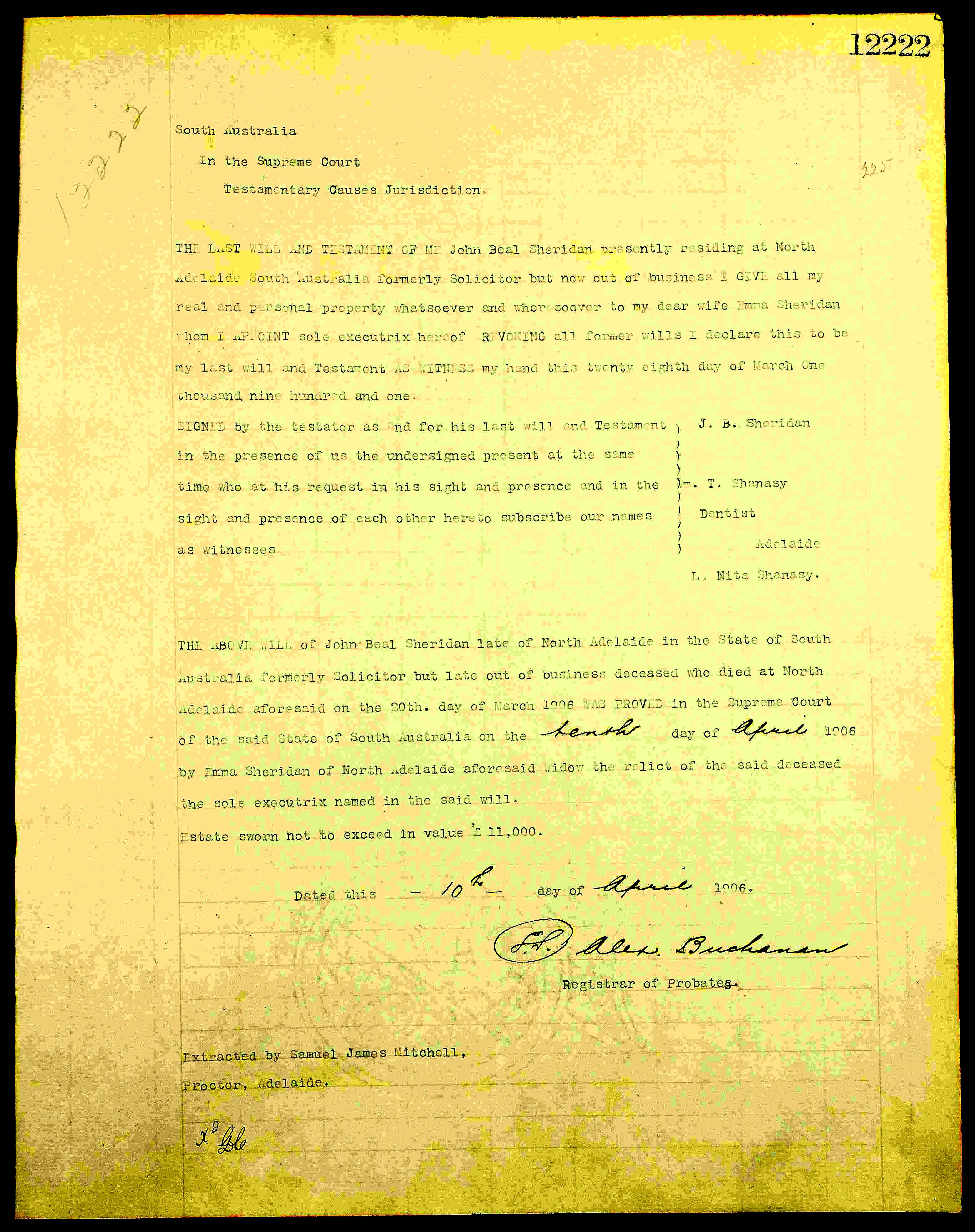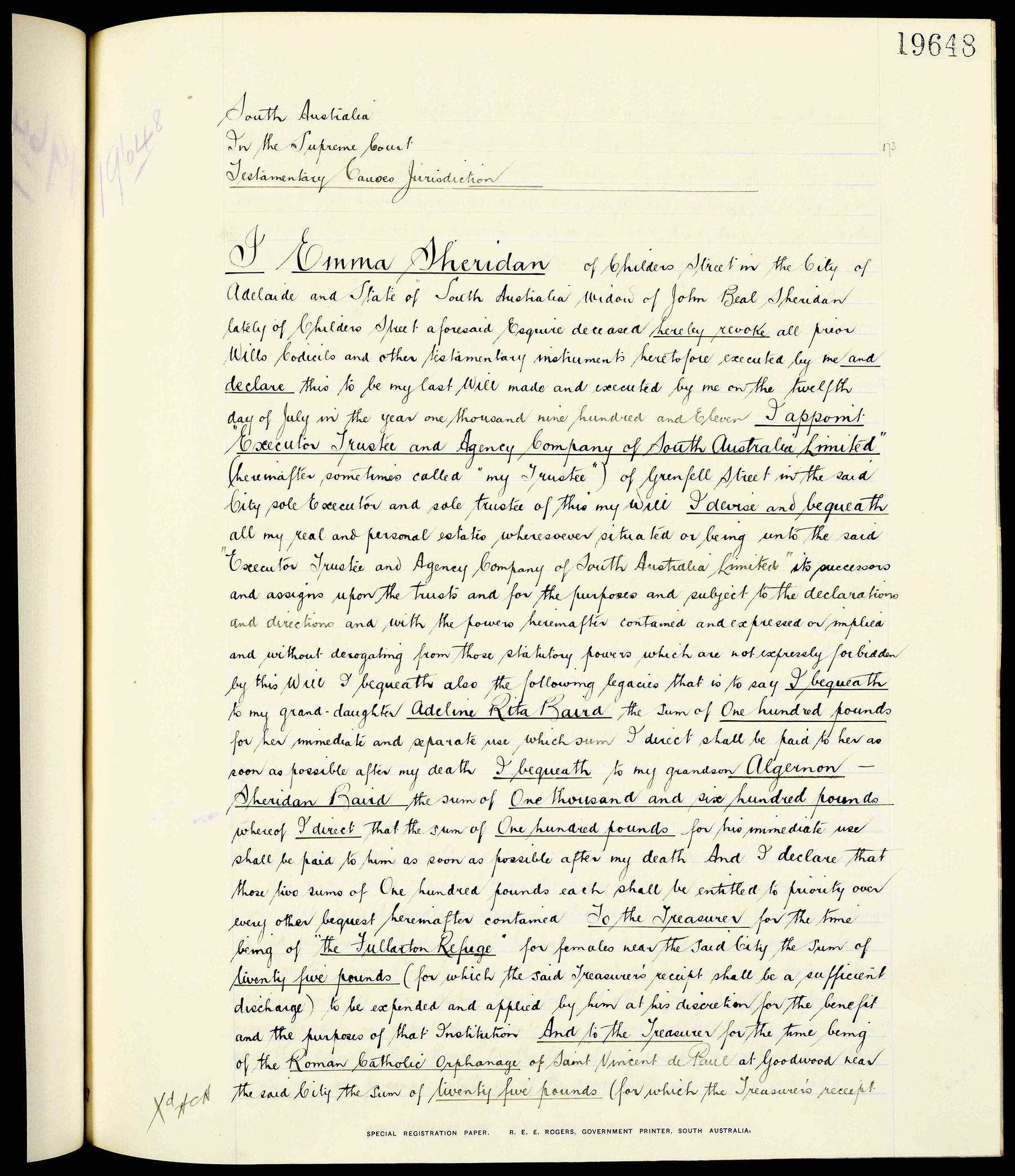 Will of Emma Mary SHERIDAN: on 2 July 1911, a few weeks after her daughter Adeline BAIRD had died in May 1911, Emma SHERIDAN made a new Will, leaving her estate to her two grandchildren Algernon and Adeline BAIRD (the children of Catherine Keith SHERIDAN). The Will was proved on 1 July 1912 and transcribed into the records of the Supreme Court. Unlike her husband's masterpiece of simplicity, Emma's Will covers 11 pages and provides for her estate to be held in trust for the grandchildren or great-grandchildren, with small bequests to a range of people and organisations including her maid and horse and carriage groom. As it happened, some of the detailed clauses were needed. Her grandson Algernon did not marry "Miss Percy" as the Will suggested he might (wishful thinking on Emma's part?) but Elsie WHITING instead. Algernon then died 10 days before his first child was born, so that the "grandson share" would have gone to the great-granddaughter Rita Sheridan BAIRD. The Court books are available on familysearch.org. (click on each image below to see the full size):