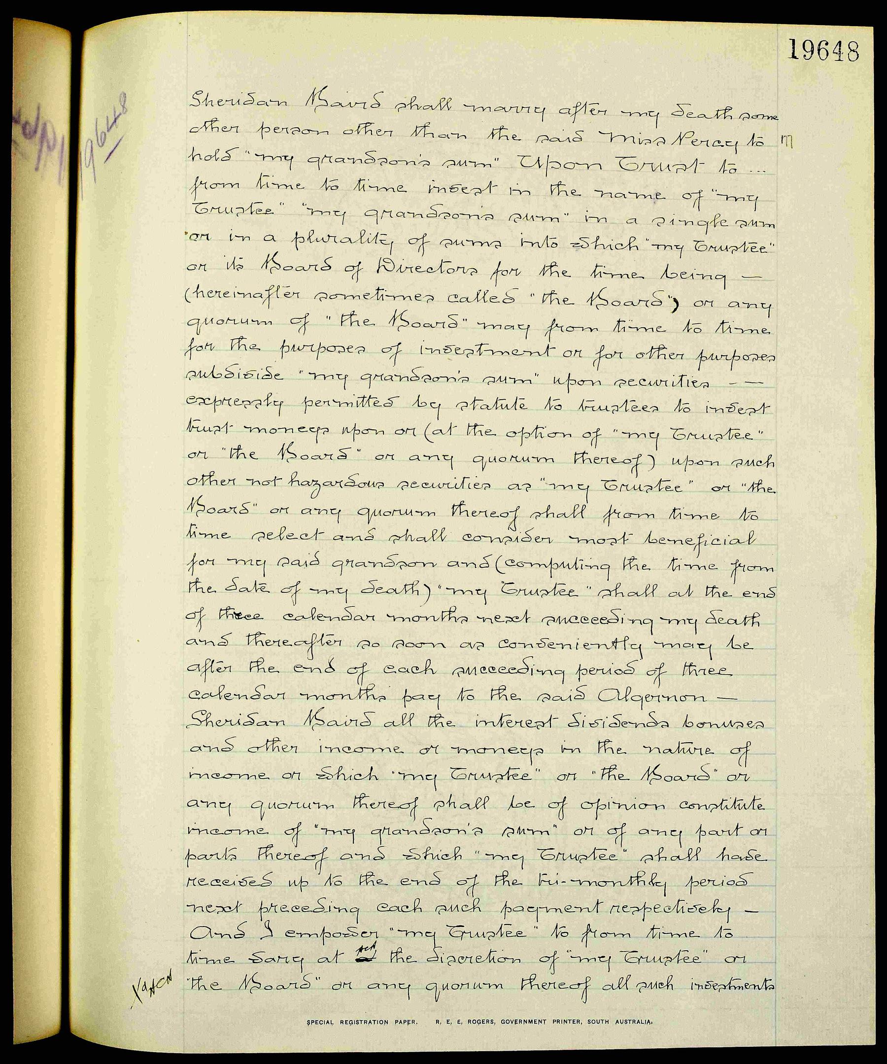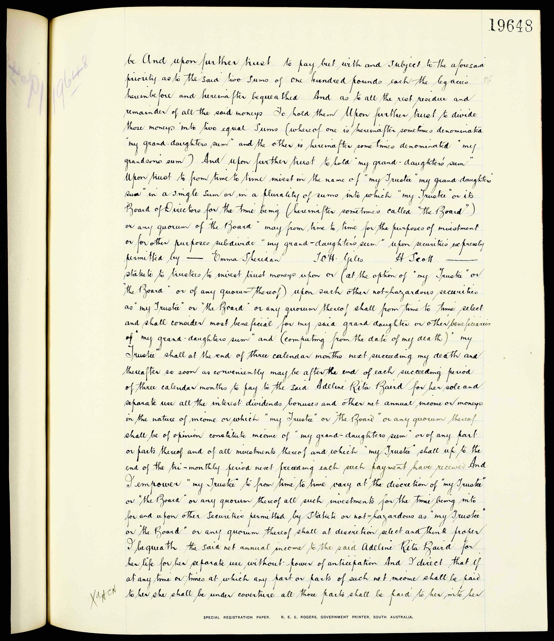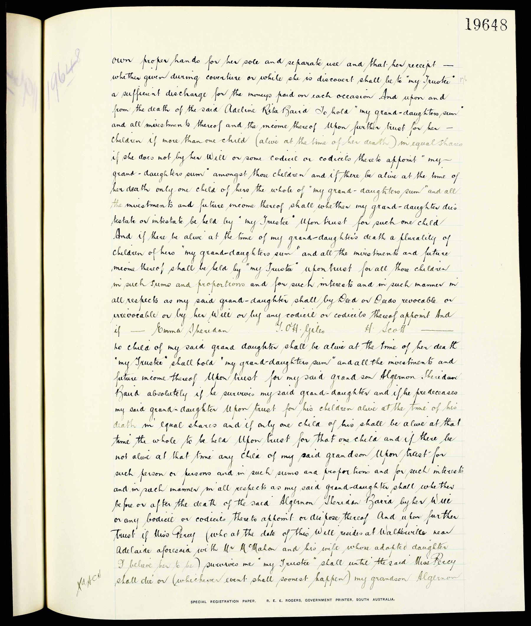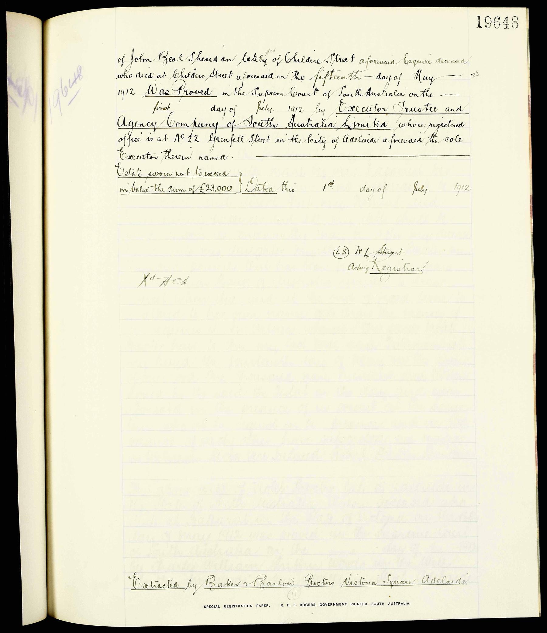 Will of Emma Mary SHERIDAN: on 2 July 1911, a few weeks after her daughter Adeline BAIRD had died in May 1911, Emma SHERIDAN made a new Will, leaving her estate to her two grandchildren Algernon and Adeline BAIRD (the children of Catherine Keith SHERIDAN). The Will was proved on 1 July 1912 and transcribed into the records of the Supreme Court. Unlike her husband's masterpiece of simplicity, Emma's Will covers 11 pages and provides for her estate to be held in trust for the grandchildren or great-grandchildren, with small bequests to a range of people and organisations including her maid and horse and carriage groom. As it happened, some of the detailed clauses were needed. Her grandson Algernon did not marry "Miss Percy" as the Will suggested he might (wishful thinking on Emma's part?) but Elsie WHITING instead. Algernon then died 10 days before his first child was born, so that the "grandson share" would have gone to the great-granddaughter Rita Sheridan BAIRD. The Court books are available on familysearch.org. (click on each image below to see the full size):