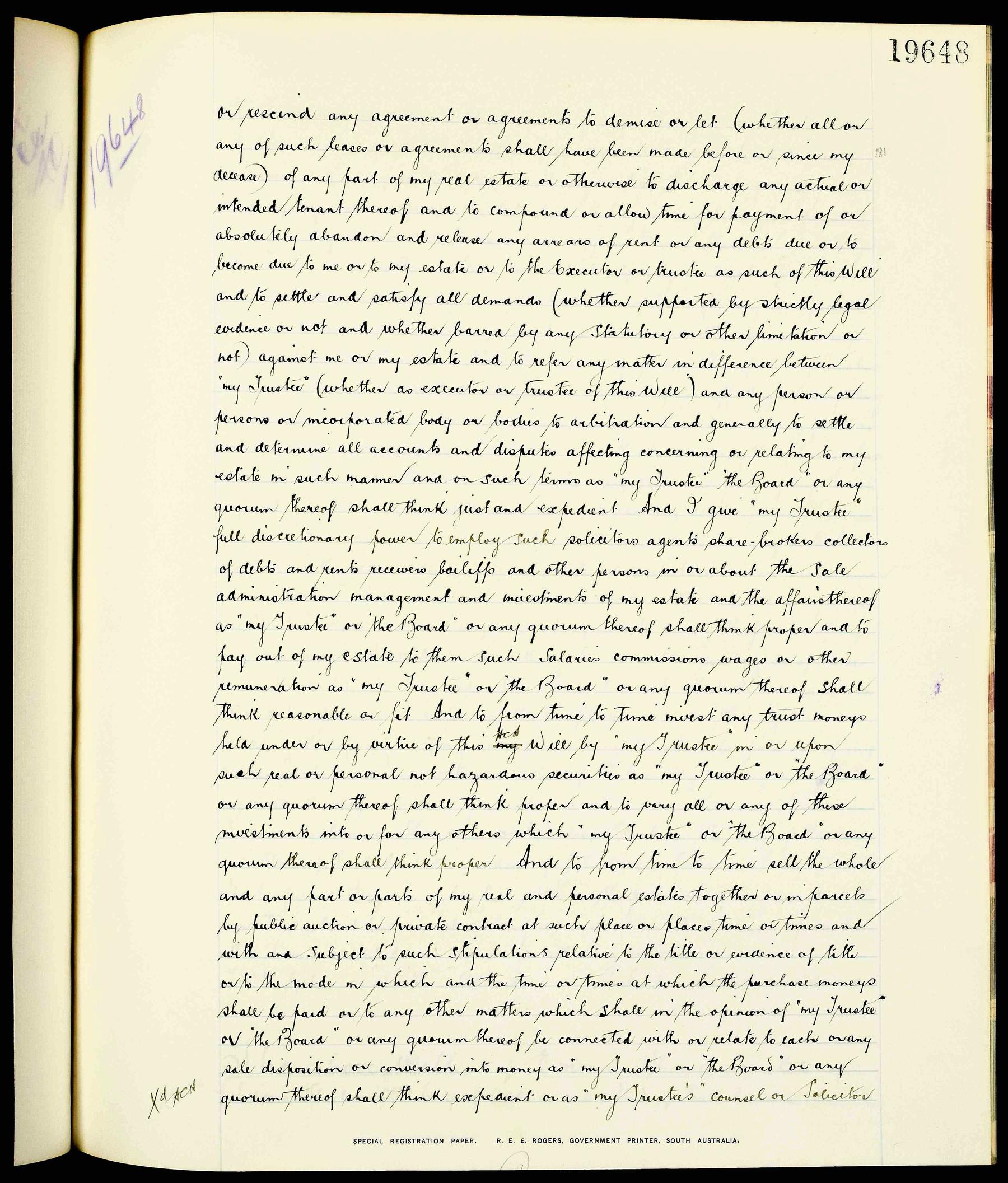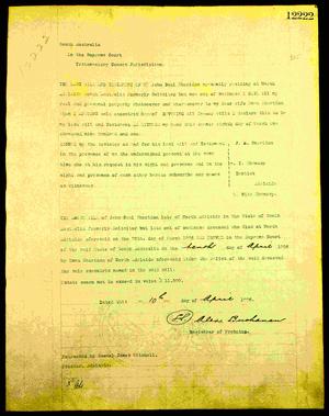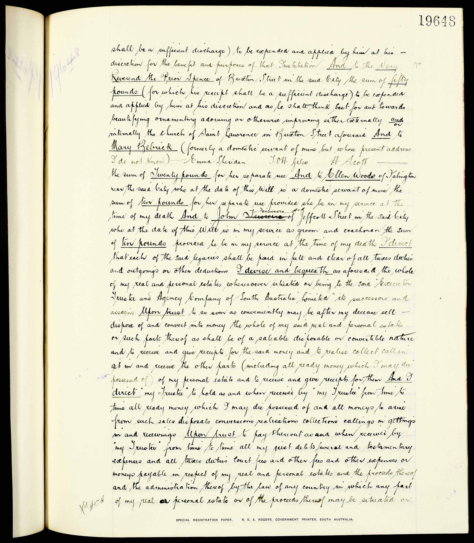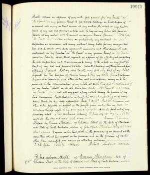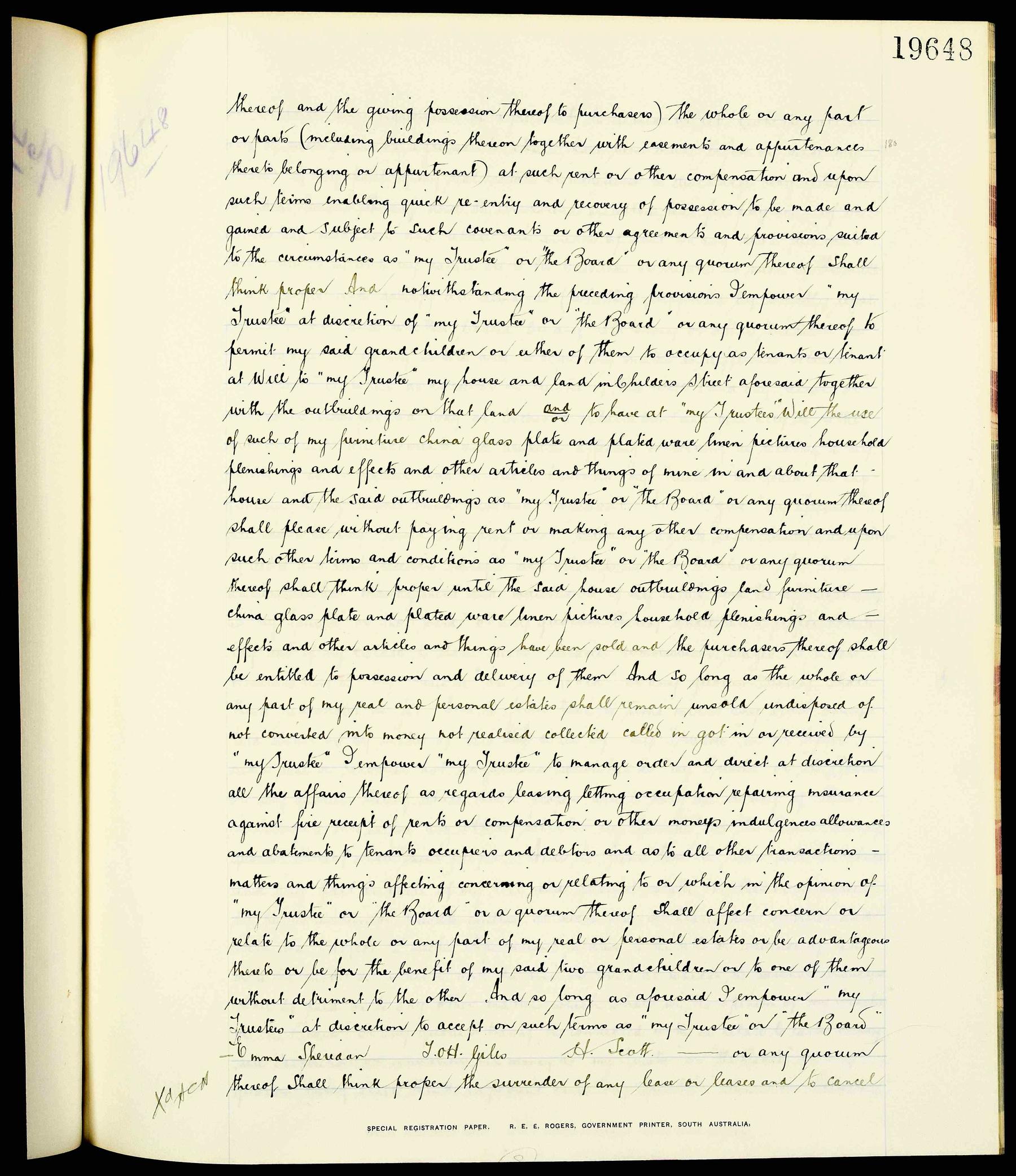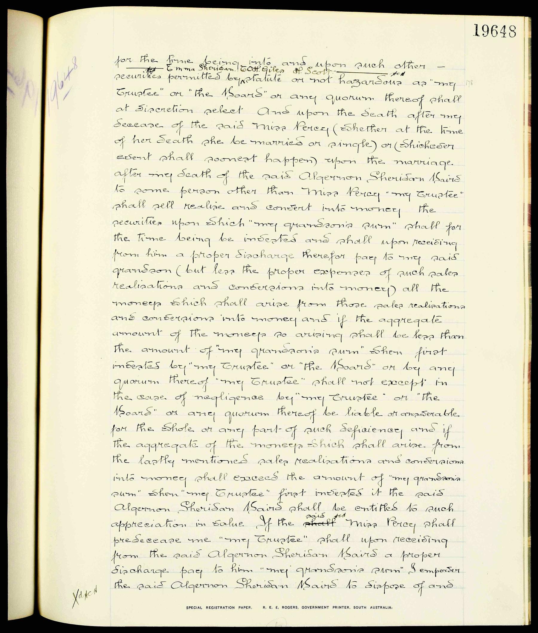 Will of Emma Mary SHERIDAN: on 2 July 1911, a few weeks after her daughter Adeline BAIRD had died in May 1911, Emma SHERIDAN made a new Will, leaving her estate to her two grandchildren Algernon and Adeline BAIRD (the children of Catherine Keith SHERIDAN). The Will was proved on 1 July 1912 and transcribed into the records of the Supreme Court. Unlike her husband's masterpiece of simplicity, Emma's Will covers 11 pages and provides for her estate to be held in trust for the grandchildren or great-grandchildren, with small bequests to a range of people and organisations including her maid and horse and carriage groom. As it happened, some of the detailed clauses were needed. Her grandson Algernon did not marry "Miss Percy" as the Will suggested he might (wishful thinking on Emma's part?) but Elsie WHITING instead. Algernon then died 10 days before his first child was born, so that the "grandson share" would have gone to the great-granddaughter Rita Sheridan BAIRD. The Court books are available on familysearch.org. (click on each image below to see the full size):