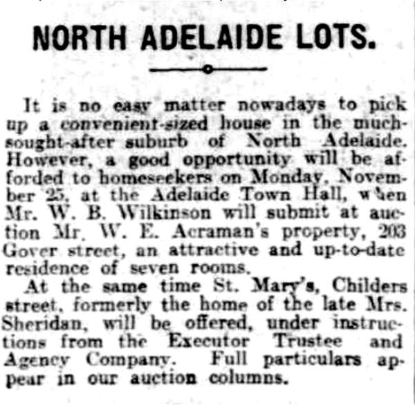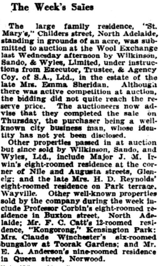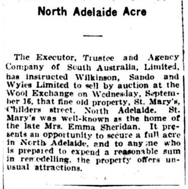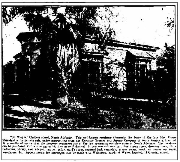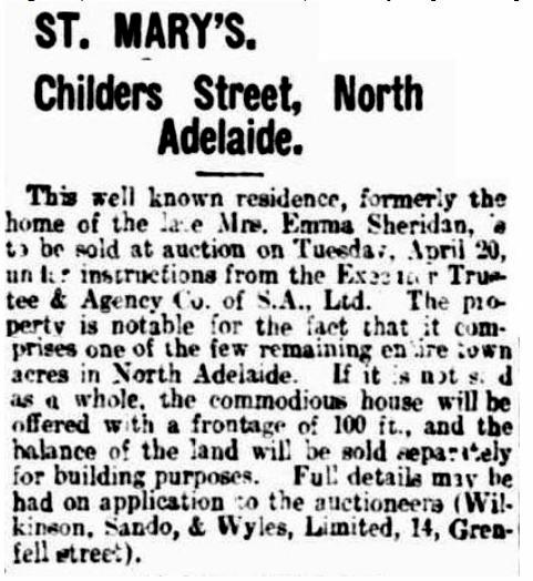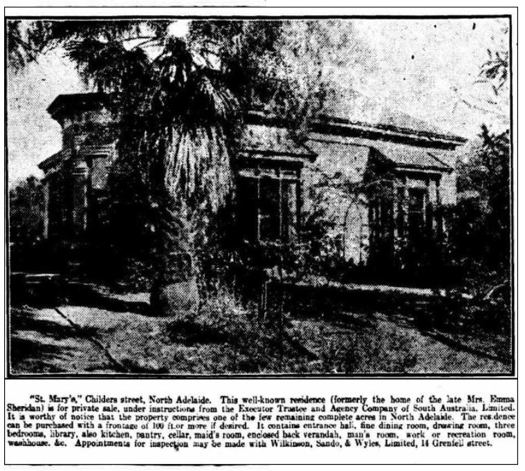St Mary's, Childers St, Adelaide: Emma's Will and other documents give an insight into the lives of John Beal and Emma Mary. For many years they lived at "St Mary's" Childers St, North Adelaide. Emma's Will allowed for her granchildren to live here after her death, cost free, if they desired, and to be able to use the furniture, glassware, silver and silver plate that she had possessed. Her Will also made small bequests to her maid and horse groom as long as they were still in her employ when she died. The fate of the property is interesting. There are several newspaper articles advertising its sale by the trustees of her estate, the first in 1912 a few months after Emma died. It would appear that the property did not sell. It was advertised again in April 1920 a few months after Emma's grandson Algernon BAIRD had died in February 1920. It did not sell then either, so was offered again in 1925. On all occasions the sale indicated the property was a "full acre". It finally sold in 1925 to a a local businessman, Mr G.J. Cowie.
