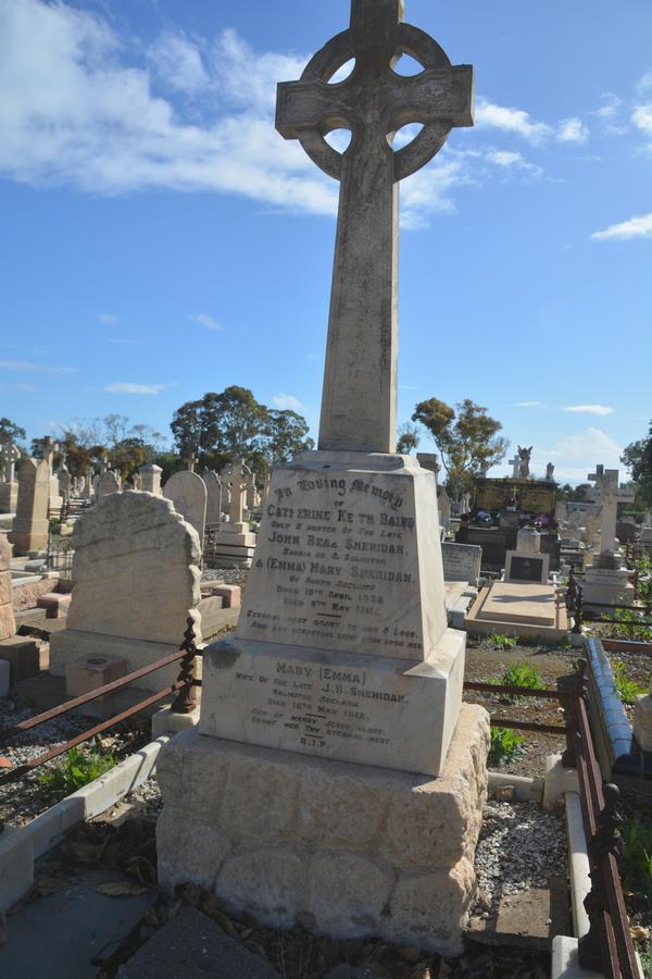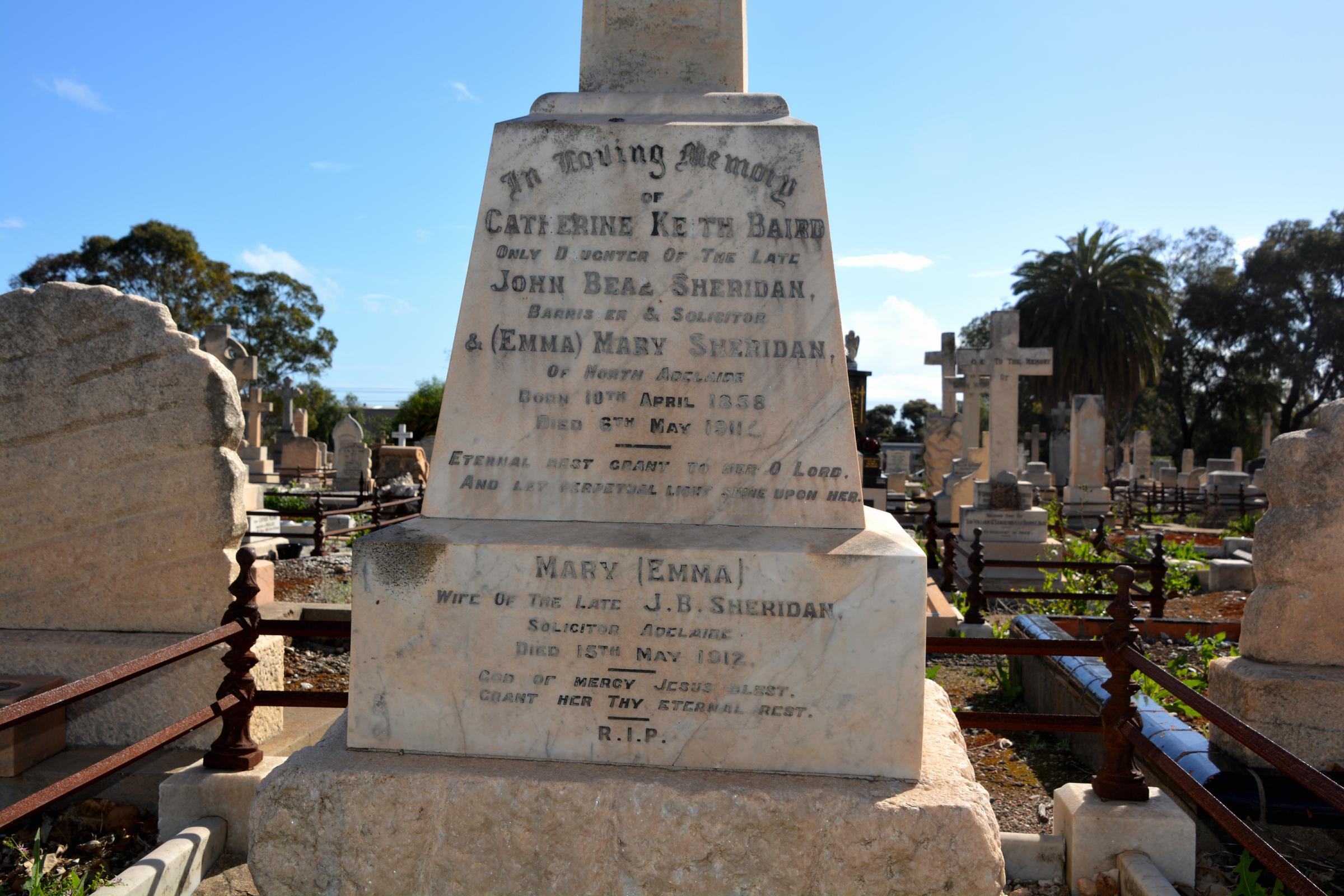 Emma Mary SHERIDAN (née BROWN) died 15 May 1912 in North Adelaide and is buried in West Terrace Cemetery. She is not buried with her husband John Beal, but their daughter Catherine Keith BAIRD (née SHERIDAN in the Catholic section of the cemetery. Catherine had died on 6 May 1911, just 12 months before Emma.